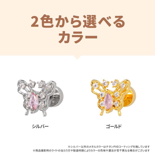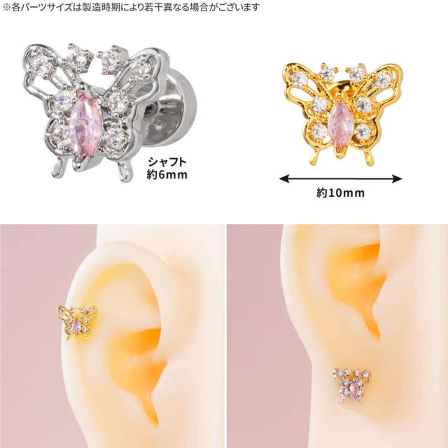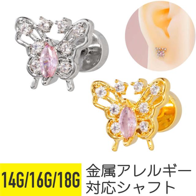 バタフライ ビジュー フラットキャッチ ストレートバーベル 14G 16G 18G サージカルステンレス ヘリックス 軟骨ピアス ボディピアス 蝶