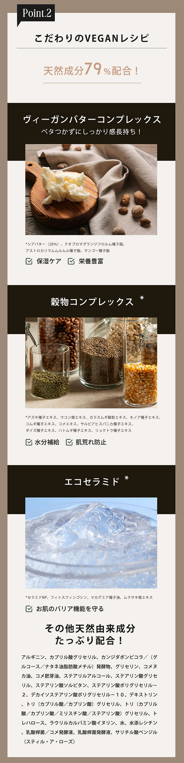 | 成分 | 【ダイブインフィグ】 水、BG、トリ(カプリル酸/カプリン酸)グリセリル、エチルヘキサン酸セチル、グリセリン、ステアリン酸ポリグリセリル-2、ステアリン酸グリセリル、ステアリルアルコール、1,2-ヘキサンジオール、ヒアルロン酸Na、エチルヘキシルグリセリン、香料、メチルグルセス-20、トリ(カプリル酸/カプリン酸/ミリスチン酸/ステアリン酸)グリセリル、ビニルジメチコン、トレハロース、セテアリルアルコール、デカイソステアリン酸ポリグリセリル-10、ステアリン酸ソルビタン、ステアリン酸グリセリル(SE)、アルギニン、カプリル酸グリセリル、カルボマー、キサンタンガム、シア脂、アラントイン、エチルヘキシルグリセリン、EDTA-2Na、デキストリン、カラメル、コメヌカ油、乳酸桿菌/コメ発酵液、リョクトウ種子エキス、ダイズ種子エキス、サルビアヒスパニカ種子エキス、コメエキス、アズキ種子エキス、コムギ種子エキス、キノア種子エキス、カラスムギ穀粒エキス、ハトムギ種子エキス、アストロカリウムムルムル種子脂、テオブロマグランジフロルム種子脂、マンゴー種子脂、ラウリルカルバミン酸イヌリン、サーファクチンNa、乳酸桿菌発酵液、カンジダボンビコラ/(グルコース/ナタネ油脂肪酸メチル)発酵物、コメ胚芽油、ウコン根エキス、マカデミア種子油、セラミドNP、フィトスフィンゴシン、水添レシチン、ムラサキ根エキス、リモネン、リナロール 【スティルアローズ】 水、BG、トリ(カプリル酸/カプリン酸)グリセリル、エチルヘキサン酸セチル、グリセリン、ステアリン酸ポリグリセリル-2、ステアリン酸グリセリル、ステアリルアルコール、1,2-ヘキサンジオール、ヒアルロン酸Na、エチルヘキシルグリセリン、香料、メチルグルセス-20、トリ(カプリル酸/カプリン酸/ミリスチン酸/ステアリン酸)グリセリル、ビニルジメチコン、トレハロース、セテアリルアルコール、デカイソステアリン酸ポリグリセリル-10、ステアリン酸ソルビタン、ステアリン酸グリセリル(SE)、アルギニン、カプリル酸グリセリル、カルボマー、キサンタンガム、シア脂、アラントイン、EDTA-2Na、デキストリン、カラメル、コメヌカ油、乳酸桿菌/コメ発酵液、リョクトウ種子エキス、ダイズ種子エキス、サルビアヒスパニカ種子エキス、コメエキス、アズキ種子エキス、コムギ種子エキス、キノア種子エキス、カラスムギ穀粒エキス、ハトムギ種子エキス、アストロカリウムムルムル種子脂、テオブロマグランジフロルム種子脂、マンゴー種子脂、ラウリルカルバミン酸イヌリン、サーファクチンNa、乳酸桿菌発酵液、カンジダボンビコラ/(グルコース/ナタネ油脂肪酸メチル)発酵物、コメ胚芽油、ウコン根エキス、サリチル酸ベンジル、セラミドNP、フィトスフィンゴシン、水添レシチン、ムラサキ根エキス、マカデミア種子油、シトロネロール、ゲラニオール 【デザートウッド】 水、BG、トリ(カプリル酸/カプリン酸)グリセリル、エチルヘキサン酸セチル、グリセリン、ステアリン酸ポリグリセリル-2、ステアリン酸グリセリル、ステアリルアルコール、1,2-ヘキサンジオール、ヒアルロン酸Na、エチルヘキシルグリセリン、香料、メチルグルセス-20、トリ(カプリル酸/カプリン酸/ミリスチン酸/ステアリン酸)グリセリル、ビニルジメチコン、トレハロース、セテアリルアルコール、デカイソステアリン酸ポリグリセリル-10、ステアリン酸ソルビタン、ステアリン酸グリセリル(SE)、アルギニン、カプリル酸グリセリル、カルボマー、キサンタンガム、シア脂、アラントイン、EDTA-2Na、デキストリン、カラメル、コメヌカ油、乳酸桿菌/コメ発酵液、リョクトウ種子エキス、ダイズ種子エキス、サルビアヒスパニカ種子エキス、コメエキス、アズキ種子エキス、コムギ種子エキス、キノア種子エキス、カラスムギ穀粒エキス、ハトムギ種子エキス、アストロカリウムムルムル種子脂、テオブロマグランジフロルム種子脂、マンゴー種子脂、ラウリルカルバミン酸イヌリン、サーファクチンNa、乳酸桿菌発酵液、カンジダボンビコラ/(グルコース/ナタネ油脂肪酸メチル)発酵物、コメ胚芽油、ウコン根エキス、マカデミア種子油、セラミドNP、フィトスフィンゴシン、水添レシチン、ムラサキ根エキス、サリチル酸ベンジル、クマリン、リモネン |