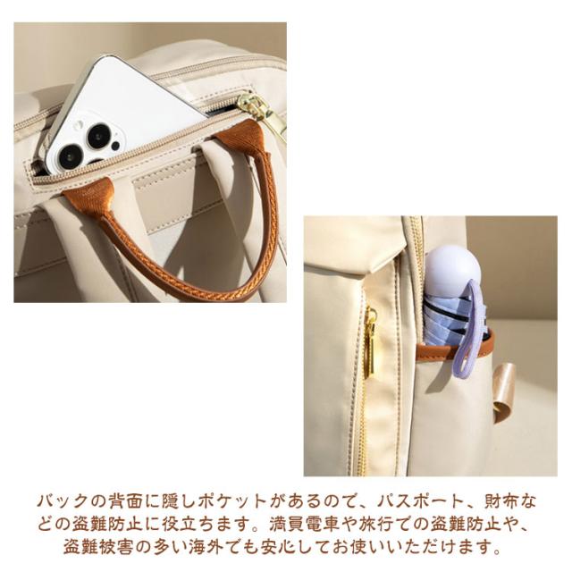 | 【大人可愛い機能的なリュックサック】通勤や通学などのデイリーはもちろん、旅行用のバッグとしてもオススメ! 【用途に合わせて使える大容量リュック】スリムなデザインに見えて、一泊分の荷物と15インチまでのノートPCが入る大容量。A4サイズの書類や雑誌、折り畳み傘、ペットボトル、財布、衣類等普段持ち歩く荷物も楽に収納できます。 【機能的なポケット】フロント部分、両サイドにはそれぞれポケットがあります。携帯電話、、財布、iPad、折り畳み傘などサッと取り出して使いたいアイテムを収納するとGOOD! 【背面ポケット付き】バックの背面に隠しポケットがあるので、パスポート、財布などの盗難防止に役立ちます。満員電車や旅行での盗難防止や、盗難被害の多い海外でも安心してお使いいただけます。 【PC専用ポケット】パソコン専用の収納ポケットは、安心の防震・防圧クッション設計!通勤や通学の際の満員電車などでも、大切なPCをしっかり保護します。 【撥水加工素材】高品質オックスフォード素材に撥水・防汚加工。水を弾くのに加え、汚れが付きにくいので、突然の雨やうっかりこぼしたコーヒーもサッと一拭きで元通り。 【移動時の負担を軽減】幅広ベルトとクッション性に優れた生地で肩や背中への負担を軽減。スーツケースに引っ掛けるキャリーオンベルトを搭載しており、出張、旅行での移動ストレスを解消! 【シンプルデザイン】シンプルで無駄のない洗練されたデザインとカラーバリエーションが魅力!年齢を問わず、普段使い、ビジネス、通勤、通学はもちろん旅行バッグとしてなどシーンを選ばずに使用できます。 | |