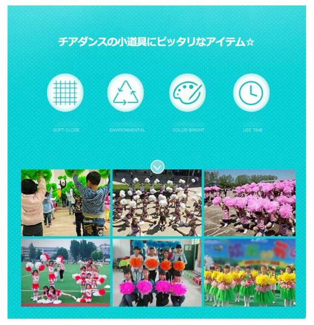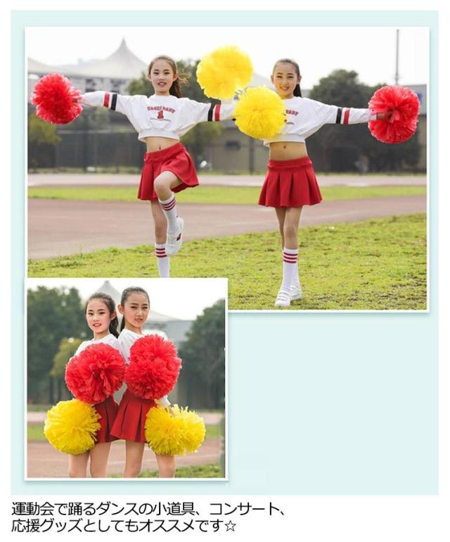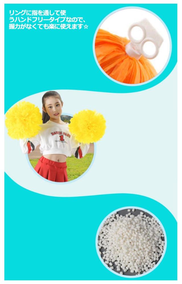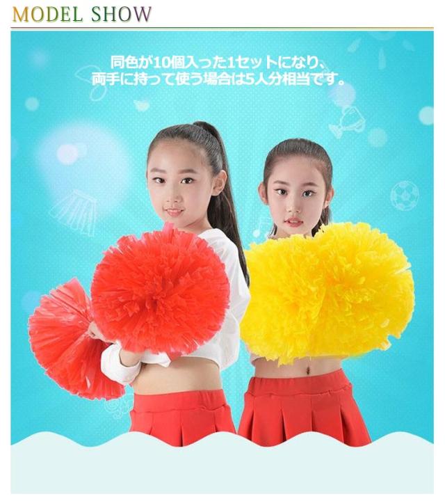 | 大人気のらくらくチアポンポンが登場 同色が10個入った1セットになり、両手に持って使う場合は5人分相当です。 チアダンスの小道具にピッタリなアイテム☆ リングに指を通して使うハンドフリータイプなので、握力がなくても楽に使えます☆ 運動会で踊るダンスの小道具、コンサート、応援グッズとしてもオススメです☆ | |
