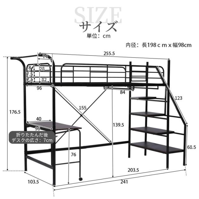 【折りたたみ式の便利なデスク】ロフトベッドの下部には、省スペースの折りたたみ式の机を設置。 勉強や仕事をするときに作業スペースとして使え、そのうえ、コンセント付き、充電が可能!デスクの脚にキャスターが付き。折りたたむことで、コンパクトなサイズになる。