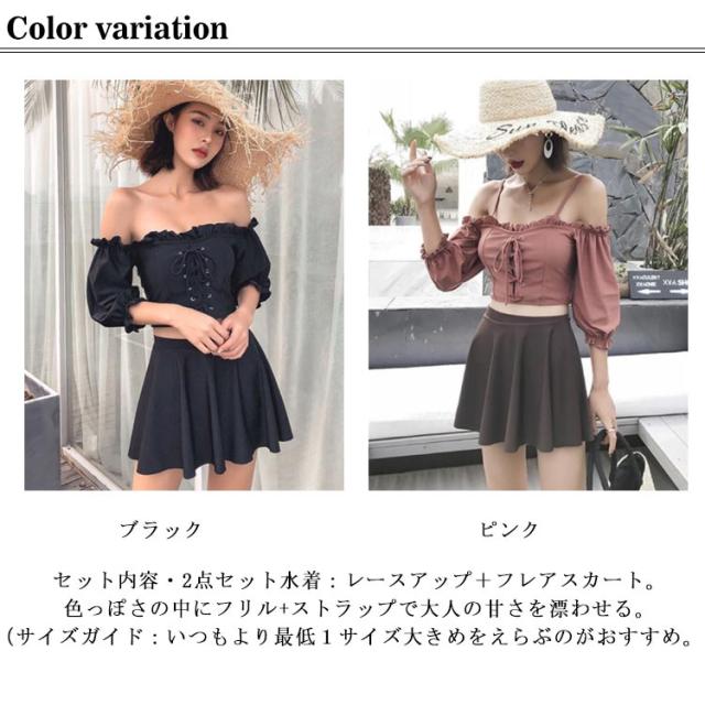 水着 レディース 2点セット セパレート フリル 女の子 大きいサイズ 高校生女子 中学生 可愛い 体型カバー パッド付き 10代 20代 中学生 高校生 韓国 黒