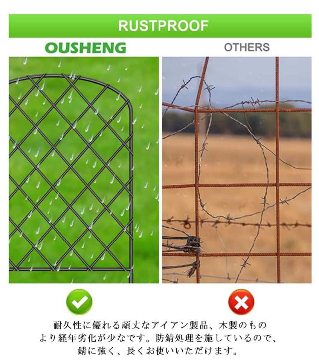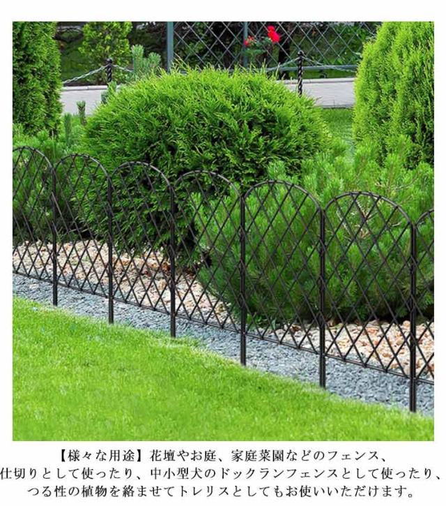 | 【6枚セット】【フェンス】【スチール製】 土や地面に差して、ジョイント式で簡単に連結できます。花壇や庭のまわりに飾って、おしゃれなアイアンフェンスです。 寄せ植えの背景などにご使用いただけます。アイアンの緩やかな曲線がガーデンを優雅に演出してくれます。 フェンスは用途に合わせて自由に連結可能。花壇の仕切りや隣家との仕切り、玄関までの通路や広いお庭の仕切りまで、幅広いシーンに対応いたします♪ すっきりとしたシンプルなシルエットも合わさり、開放的なお庭づくりに最適です。高級感のあるクラシカルなアイアンフェンスで、ヨーロッパのお庭のような優雅な空間づくりを。 耐久性に優れる頑丈なアイアン製品、木製のものより経年劣化が少なです。防錆処理を施しているので、錆に強く、長くお使いいただけます。 【様々な用途】花壇やお庭、家庭菜園などのフェンス、仕切りとして使ったり、中小型犬のドックランフェンスとして使ったり、つる性の植物を絡ませてトレリスとしてもお使いいただけます。 | |