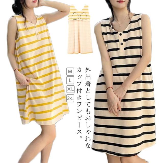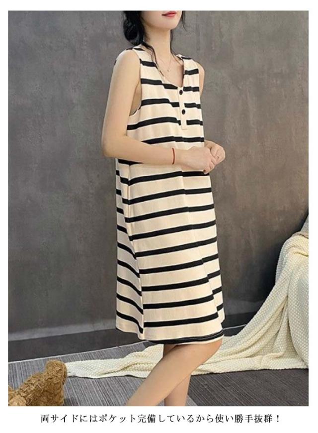 タンクワンピース カップ付き ワンピース ひざ丈 カップ付きワンピース キャミワンピ パジャマ ルームウェア ルームワンピース ボーダー レディース ポケット付き 綿コットン ロングパンツワンピース 部屋着 20代 30代 40代