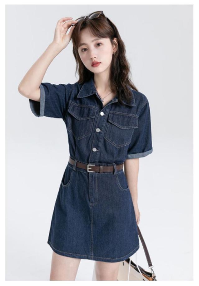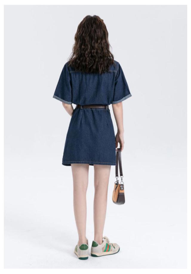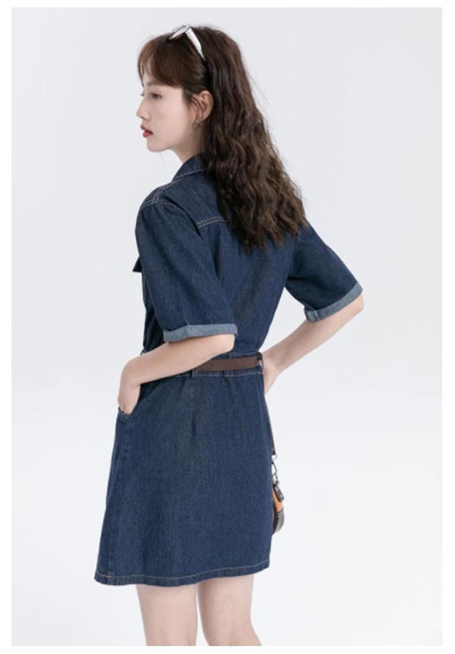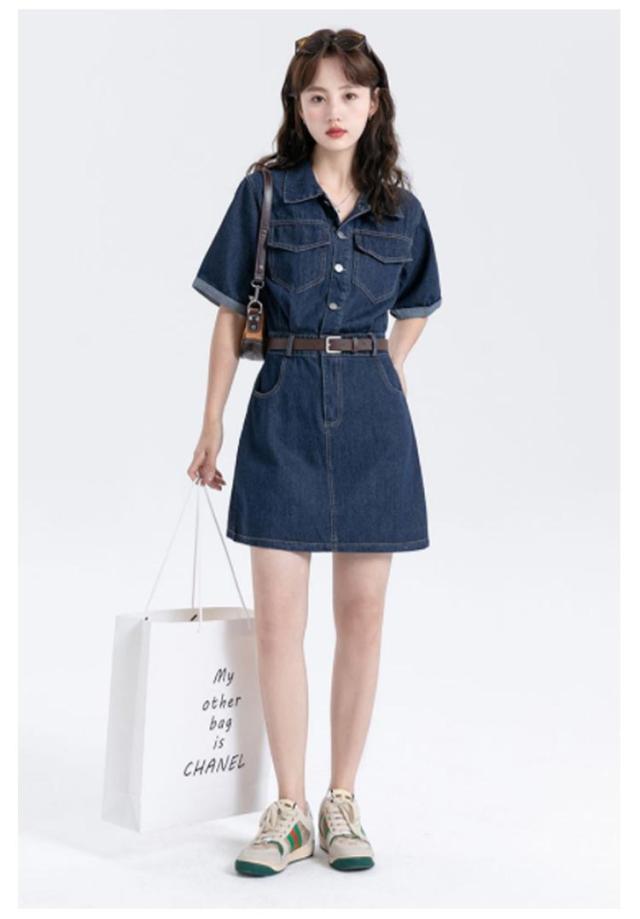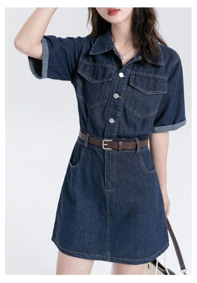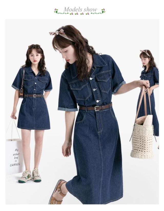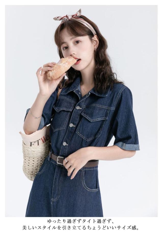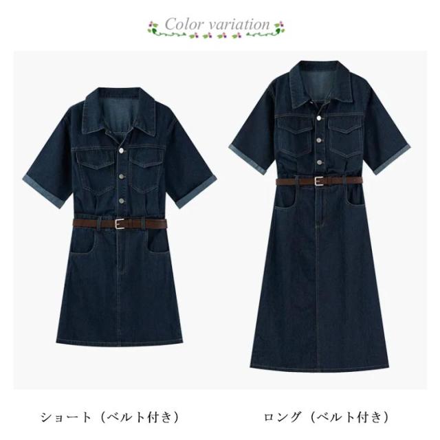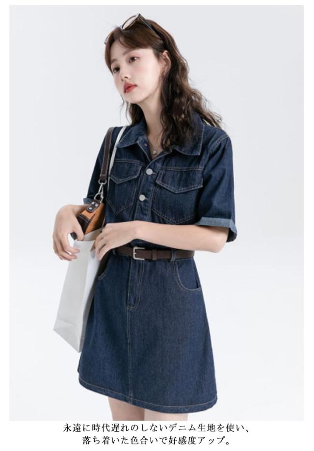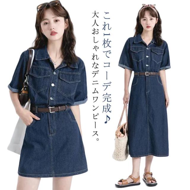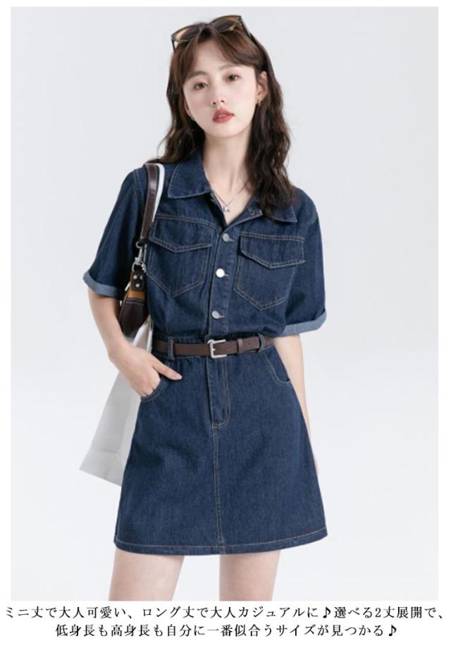 ワンピース デニム レディース 半袖 韓国ファッション シャツワンピ デニムワンピ 選べる2丈 ミニ丈 ロング丈 ひざ上 ミモレ丈 スタンダードカラー デニムワンピース ウエストマーク ベルト アメカジ カジュアル ワンピース
