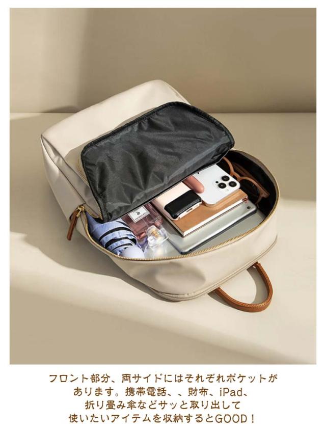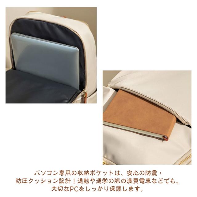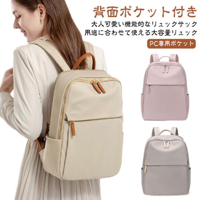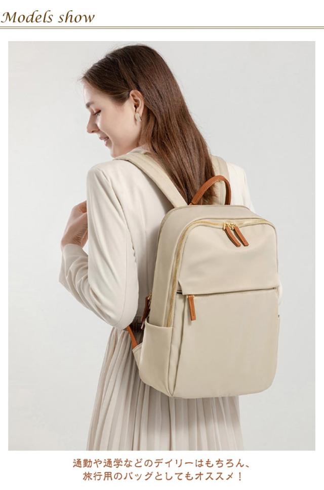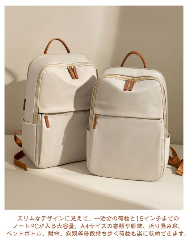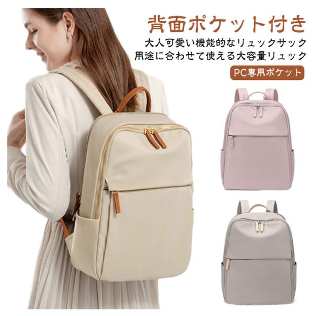 | 【大人可愛い機能的なリュックサック】通勤や通学などのデイリーはもちろん、旅行用のバッグとしてもオススメ! 【用途に合わせて使える大容量リュック】スリムなデザインに見えて、一泊分の荷物と15インチまでのノートPCが入る大容量。A4サイズの書類や雑誌、折り畳み傘、ペットボトル、財布、衣類等普段持ち歩く荷物も楽に収納できます。 【機能的なポケット】フロント部分、両サイドにはそれぞれポケットがあります。携帯電話、、財布、iPad、折り畳み傘などサッと取り出して使いたいアイテムを収納するとGOOD! 【背面ポケット付き】バックの背面に隠しポケットがあるので、パスポート、財布などの盗難防止に役立ちます。満員電車や旅行での盗難防止や、盗難被害の多い海外でも安心してお使いいただけます。 【PC専用ポケット】パソコン専用の収納ポケットは、安心の防震・防圧クッション設計!通勤や通学の際の満員電車などでも、大切なPCをしっかり保護します。 【撥水加工素材】高品質オックスフォード素材に撥水・防汚加工。水を弾くのに加え、汚れが付きにくいので、突然の雨やうっかりこぼしたコーヒーもサッと一拭きで元通り。 【移動時の負担を軽減】幅広ベルトとクッション性に優れた生地で肩や背中への負担を軽減。スーツケースに引っ掛けるキャリーオンベルトを搭載しており、出張、旅行での移動ストレスを解消! 【シンプルデザイン】シンプルで無駄のない洗練されたデザインとカラーバリエーションが魅力!年齢を問わず、普段使い、ビジネス、通勤、通学はもちろん旅行バッグとしてなどシーンを選ばずに使用できます。 | |