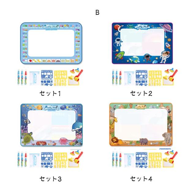 | 【お絵かきシート】【100cm×80cm】【選べる14セット】【水で描く】 【商品情報】 水をペンに入れるだけでおえかきできるお絵描きシートです インクなどは要らず、水だけで描けるお絵描きシートですので、床、壁、洋服を汚しません。 100cm×80cmの大きいサイズですので、子供が自由にのびのびと楽しくおえかきができます。 お子さんへの誕生日・入園・入学・クリスマスプレゼントとしても最適です。 材質:無毒で環境に優しい素材を使っています。 付属の印鑑、スタンプ、及びローラーを水で濡らすだけでキャンバスに対応してイラストを描くことができて簡単に使用できます。 【水で描いても汚れない】 付属のペンに水を入れたらすぐお絵かきができるので非常に簡単です。約10分後には乾いてすぐ繰り返し使えるので、洋服やお部屋を汚さずにのびのびお絵かきすることができます。シートは折り畳んで収納できるので、お出かけ先にも持ち運びでき便利です。 【知育おもちゃ】 水で描くと発色しカラフル色を楽しむことができます。お絵かきして遊ぶことで、カラーセンスを磨き英語や数字の勉強もできます。子供の右脳開発、認識能力、創造力などを向上させることができます。 | |