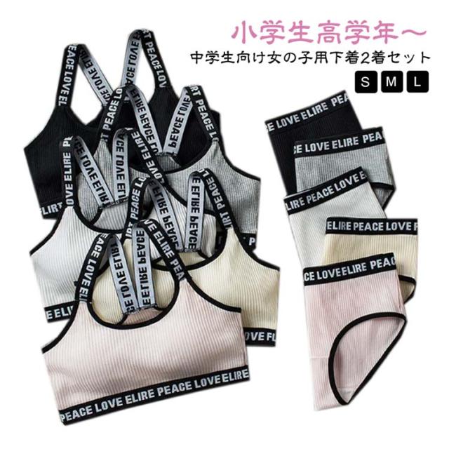 | 小学生高学年〜中学生向け女の子用下着2着セット スポーツブラとパンツの上下2着セット販売です。 修学旅行・水泳・スイミング・部活・体育やお泊り会におすすめのジュニア向けアウターセット。 シンプルでおしゃれな人気の英字ロゴテープデザインがポイント。 伸縮性のあるノンストレスな着心地。 体にピッタリフィットして揺れないのでダンス衣装のインナーとしても大活躍! 見えてもかっこいい英字肩紐のスポブラなので、ブラジャーはまだ早いキッズのチューブトップやブラトップとしても安心して着用いただけます。 ファーストブラにおすすめ、パット入りなので安心。 新学期や新年に向けて新しい下着セットは色違いでも欲しくなっちゃう! | |