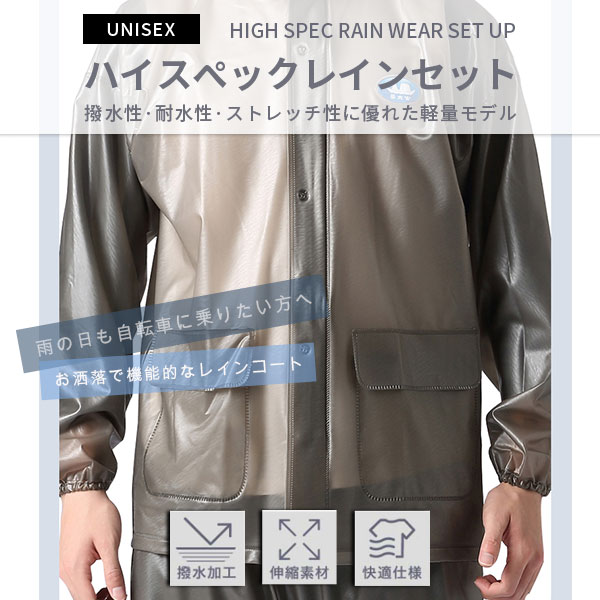 ◎シンプルな構成でお求めやすい価格のレインウェア上下セット。