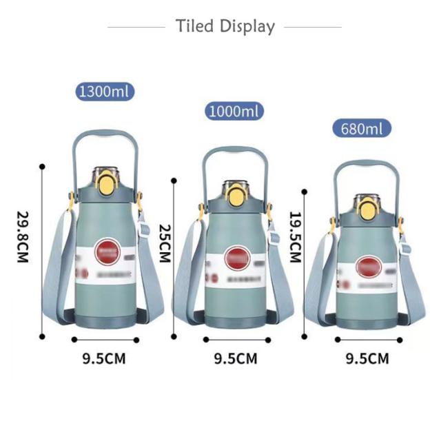 | 680/1000/1300ML!大容量・使い勝手のいい保冷保温水筒 ハンドルとショルダーストラップ付きで、手提げしたり、斜め掛けたりできるから、学校、外出やアウトドア時にとても便利。 外気の熱の影響を受けにくい真空二重構造、長時間氷をキープします。 ロックを解除し、ワンタッチオープンで簡単にふたを開けることができます。フタの裏面にシリコーンのパッキン付きなので、しっかり閉まって、中身がこぼれにくい。 そのまま飲めることもできるし、ストローを利用することもできます。スポーツや部活、アウトドアに最適なスポーツジャグです。 大きなな口径、大きめ氷もラクラク入ります。 各パーツは取り外し可能、いつも清潔に。 | |
