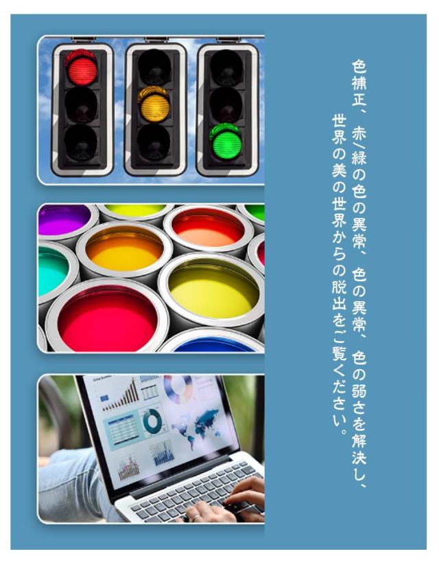 | 色盲メガネ 赤と緑の色覚異常補正メガネ 【色覚異常の補正】色補正、赤/緑の色の異常、色の異常、色の弱さを解決し、世界の美の世界からの脱出をご覧ください。 【屋内および屋外での使用】赤緑メガネは明るい環境ではよりよく機能しますが、屋内および屋外での使用に適しています。 【ファッションフレームメガネ】これらの色盲メガネは、男性と女性に適した、モダンでスタイリッシュなデザインのフルフレームとハーフフレームです。コンピューターや携帯電話からの青色光を遮断するのに適しています。 【品質コーティング】これらのガラスには、色覚を強化することで色覚異常(CVD)の人々を助ける独自の色強化コーティングが施されています。このメガネは、色覚異常の人に完全な色覚を提供することを目的としたものではありません。フルカラービューなどを提供しません。 | |