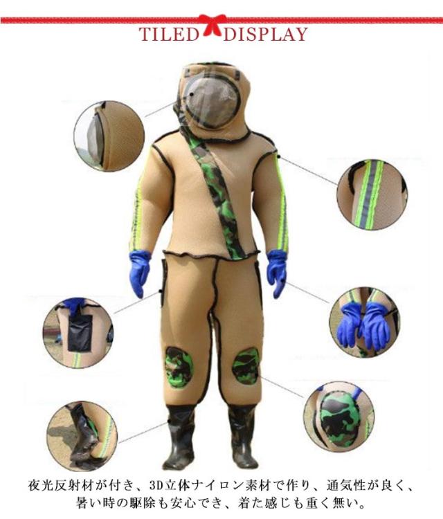 | 夜光反射材が付き、3D立体ナイロン素材で作り、通気性が良く、暑い時の駆除も安心でき、着た感じも重く無い。 軽くて蒸れにくい作りで、超軽量で着心地が良く、自由自在に作業できます。 扇風機3つが付いています(バッテリーが付きません。市販のバッテリーがすべて使えます。) 厚手の素材を採用、最も刺されやすい屈折部(肘・膝・脇)と肩、背中に厚みのある当社独自の特殊パッド採用。毒針の貫通をシャットアウト。 養蜂スーツだけではなく、スズメバチ駆除も巣を撤去も、ガーデニングなどの虫よけ、虫さされ対策としてもつかえます。 | |
