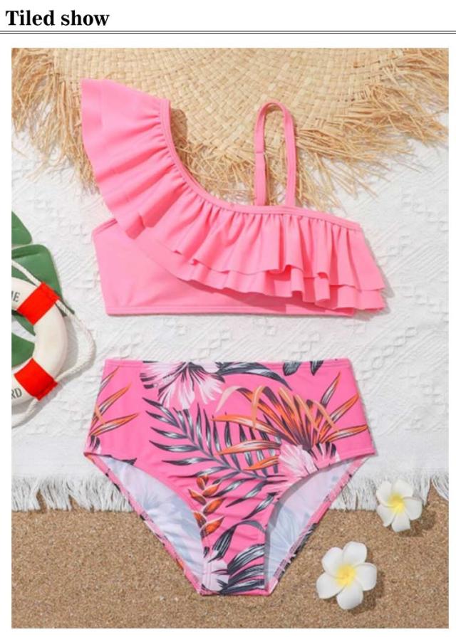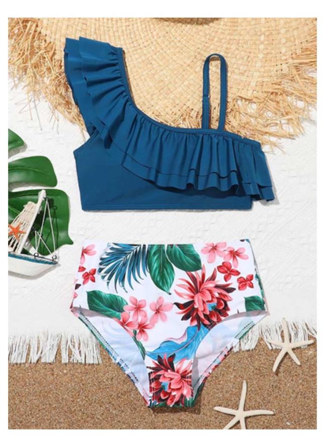 | 可愛いワンショルダーセパレート水着♪ おしゃれな大人水着のテイストを盛り込んで素敵ワンショルダーデザイン、フリフリフリルが女の子らしい可愛い水着。 無地トップスに高級感のあるボタニカル柄はリゾート感満載の上下セットスイムウェア。 バッド付きで思春期のお子様にも安心◎ | |