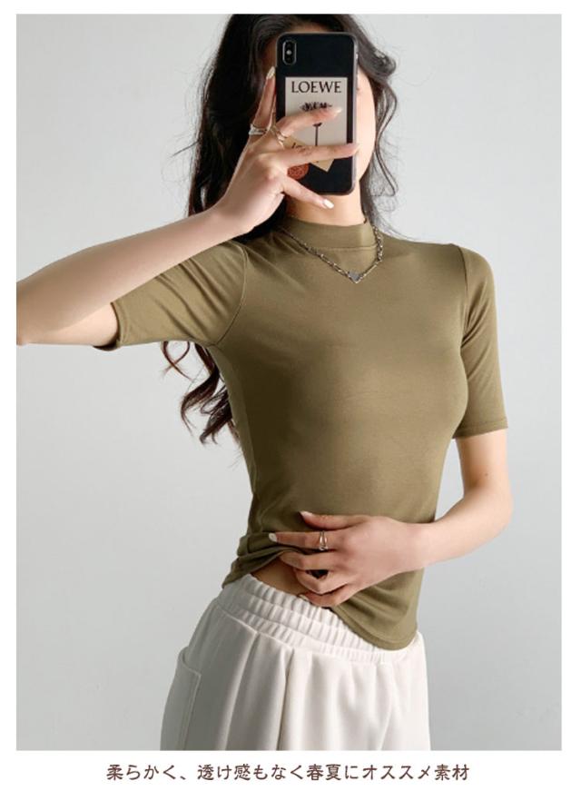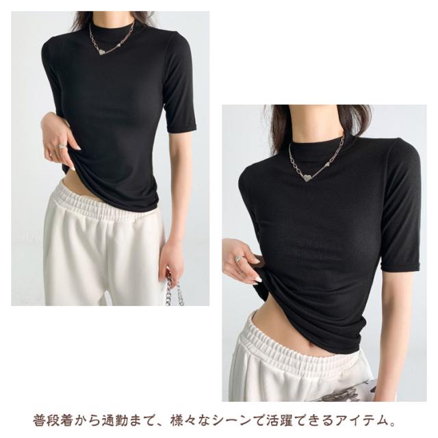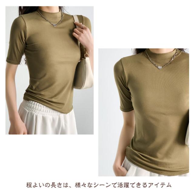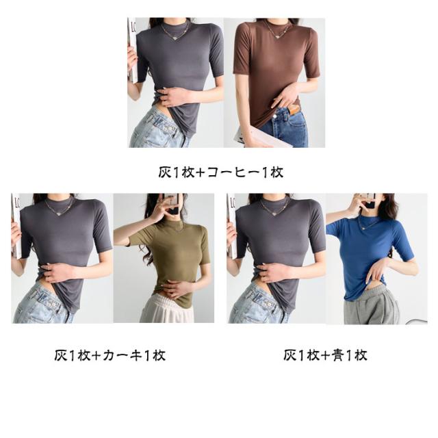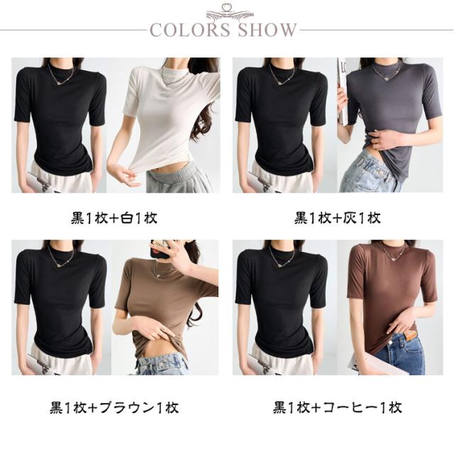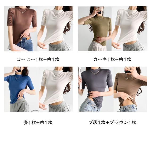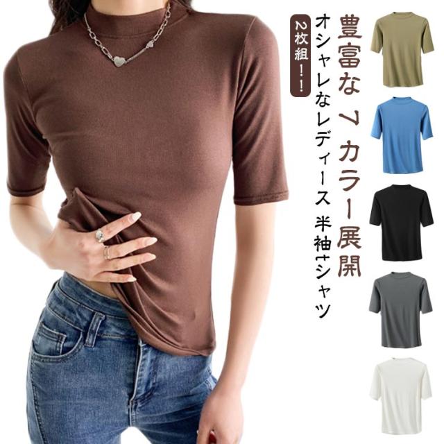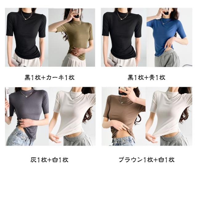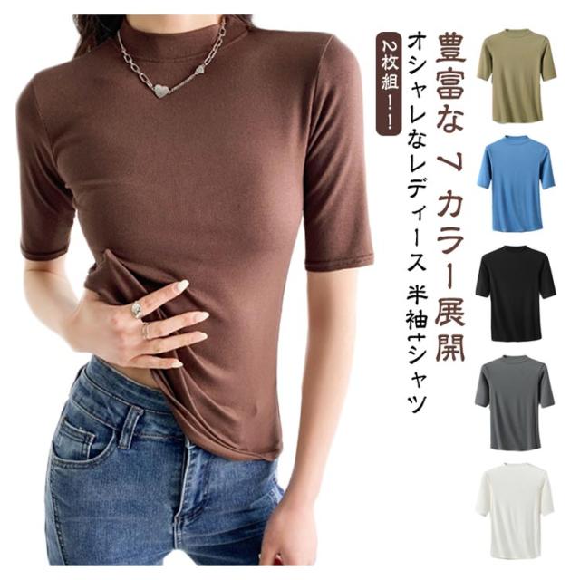 【2枚セット】レディース トップス 半袖 Tシャツ 五分袖 春 夏 秋 Tシャツ ゴルフ ハイネックtシャツ 日焼け対策 無地 カットソー 半袖tシャツ 薄手 フィット スリム トレーナー 20代 30代 40代 OL 送料無料