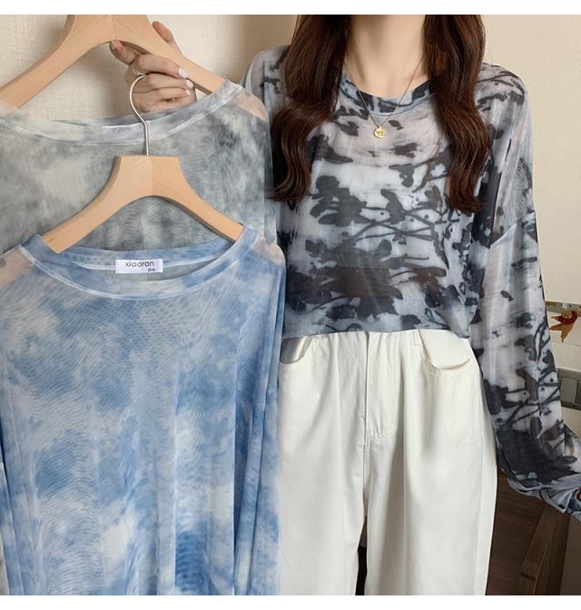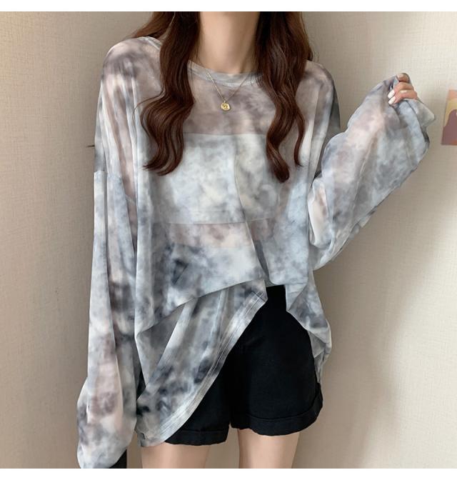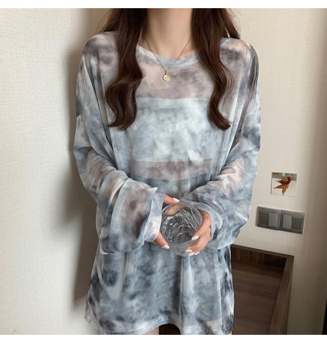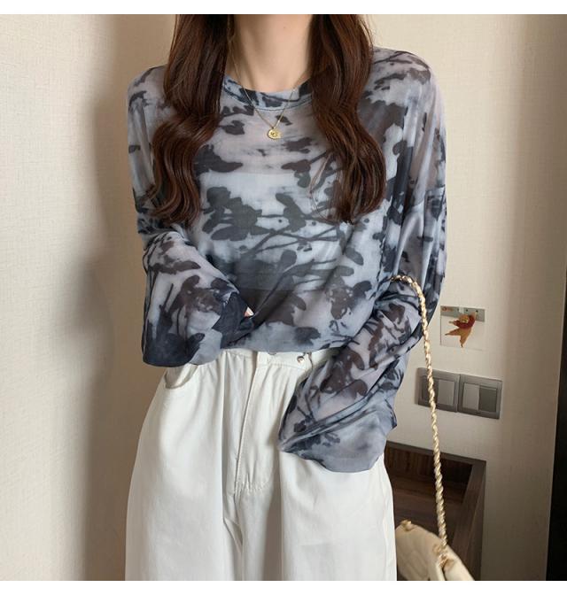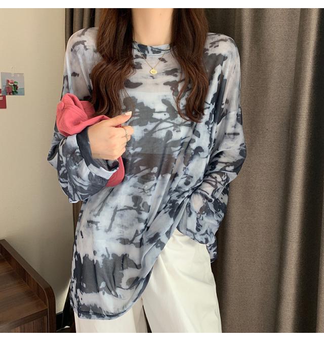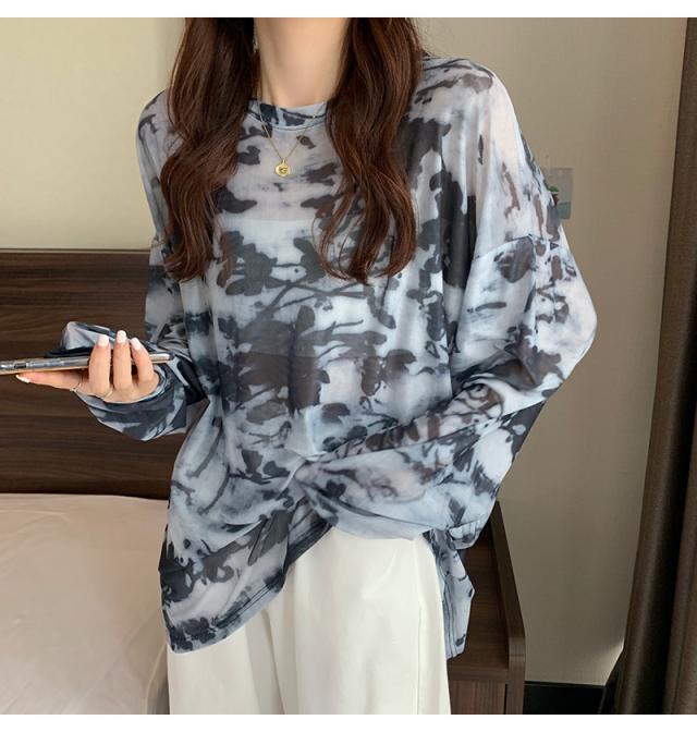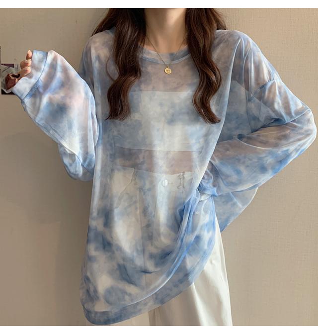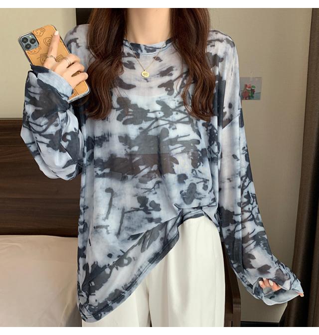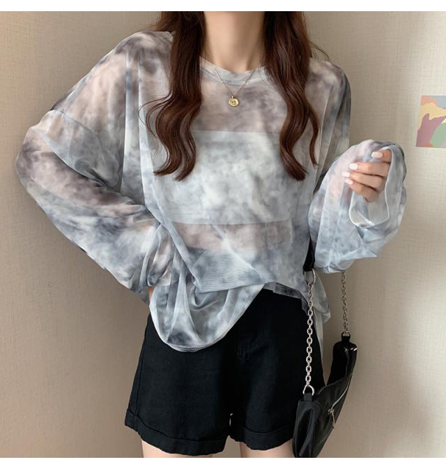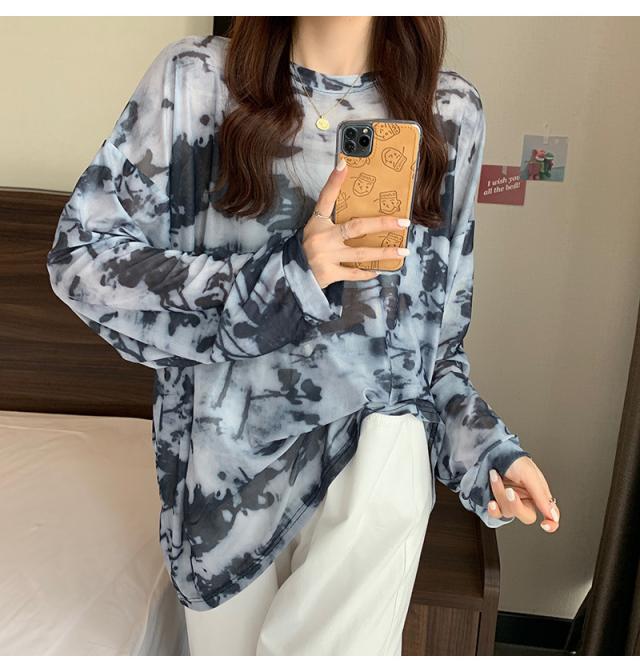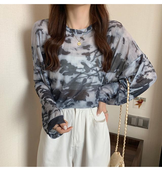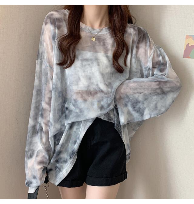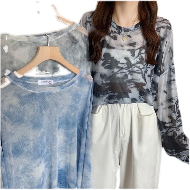 シアー トップス メッシュブラウス 透け感 カットソー 染め 長袖 フリル シースルレース 水彩プリントドルマンTシャツ 送料無料