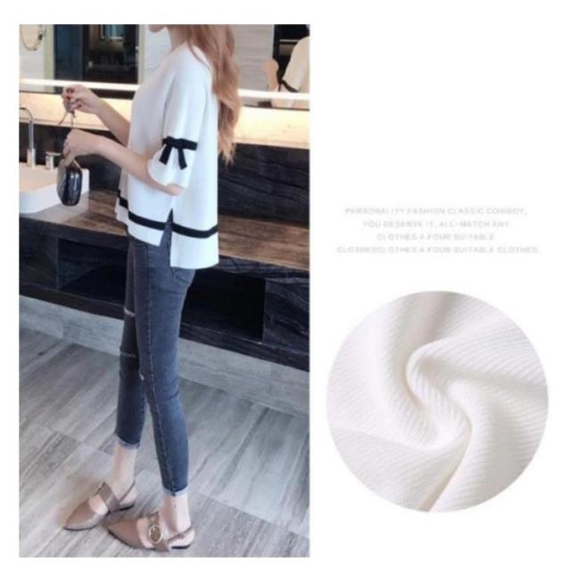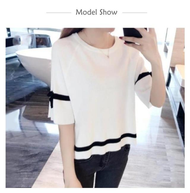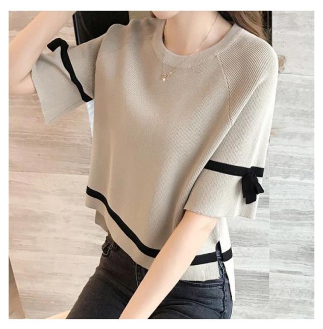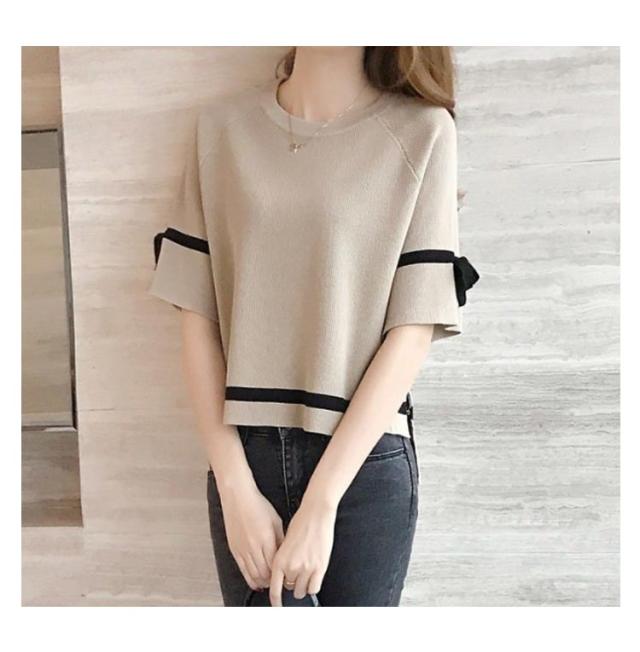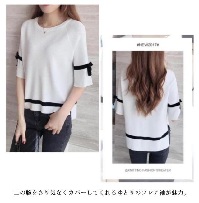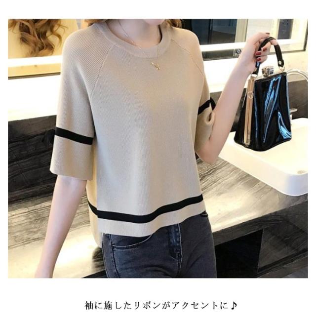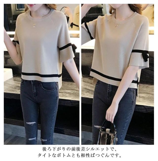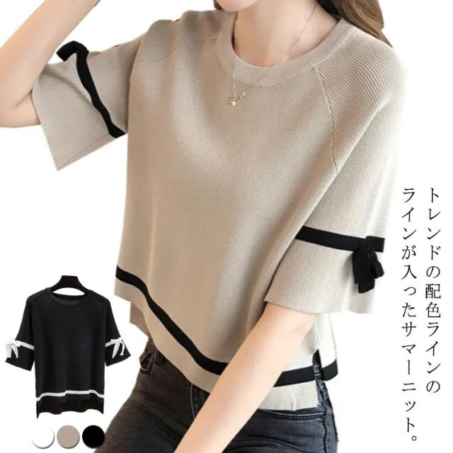 サマーニット レディース カットソー 五分袖 半袖 ショート丈 ひんやり 接触冷感 ニット トップス プルオーバー フレア袖 配色ライン リボン クールネック ニットソー Tシャツ 涼しい ニット セーター カジュアル ゆったり 体型カバー 春 夏 送料無料