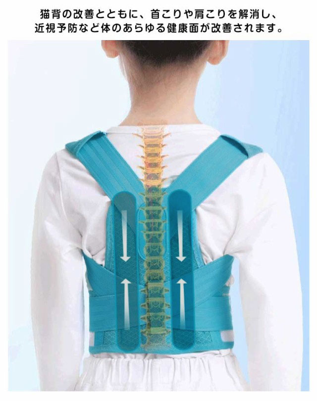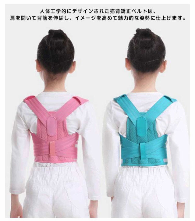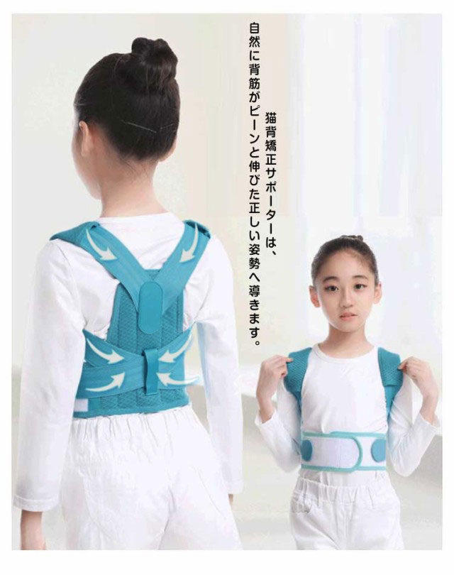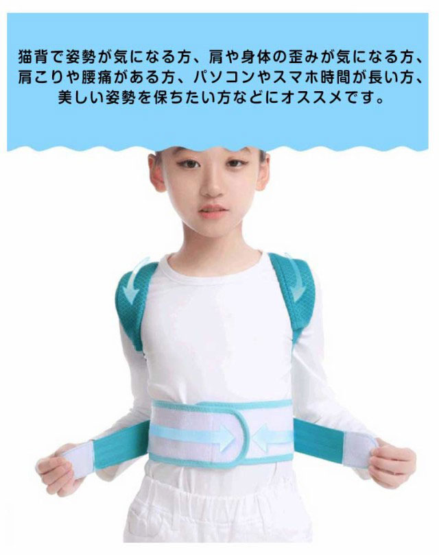 | 正しい姿勢で理想のボディへ!子供用 背筋矯正ベルト 猫背矯正サポーターは、自然に背筋がピーンと伸びた正しい姿勢へ導きます。 猫背の改善とともに、首こりや肩こりを解消し、近視予防など体のあらゆる健康面が改善されます。 猫背はお腹に脂肪がたまりやすく、肩こりや腰痛になるだけでなく、見た目の印象を悪くする。 人体工学的にデザインされた猫背矯正ベルトは、肩を開いて背筋を伸ばし、イメージを高めて魅力的な姿勢に仕上げます。 メッシュ素材で、通気性と快適性が向上します。 マジックテープを使用し、脱着便利で体型や好みの諦め加減に合わせて自由に調整可能。 猫背で姿勢が気になる方、肩や身体の歪みが気になる方、肩こりや腰痛がある方、パソコンやスマホ時間が長い方、美しい姿勢を保ちたい方などにオススメです。 | |