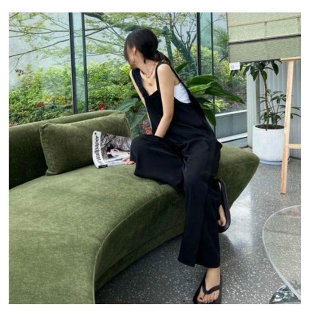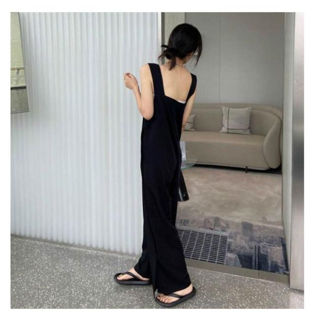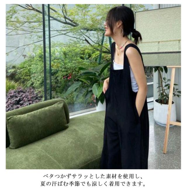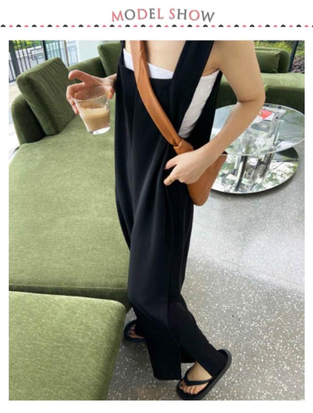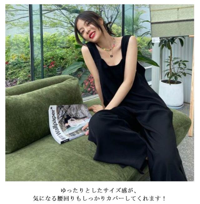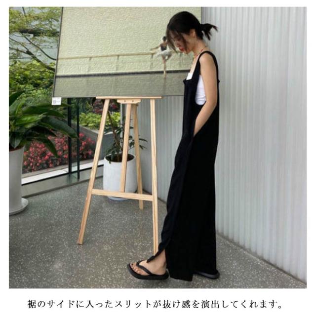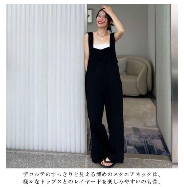 カジュアル 春 オールインワン レディース 夏 つなぎ パンツ オーバーオール スクエアネック 体型カバー ロングパンツ パンツ 大人 重ね着 レイヤード ゆったり 大きいサイズ スリット ボトムス ワイドパンツ 無地 きれいめ シンプル 可愛い ブラック 春 サロペット