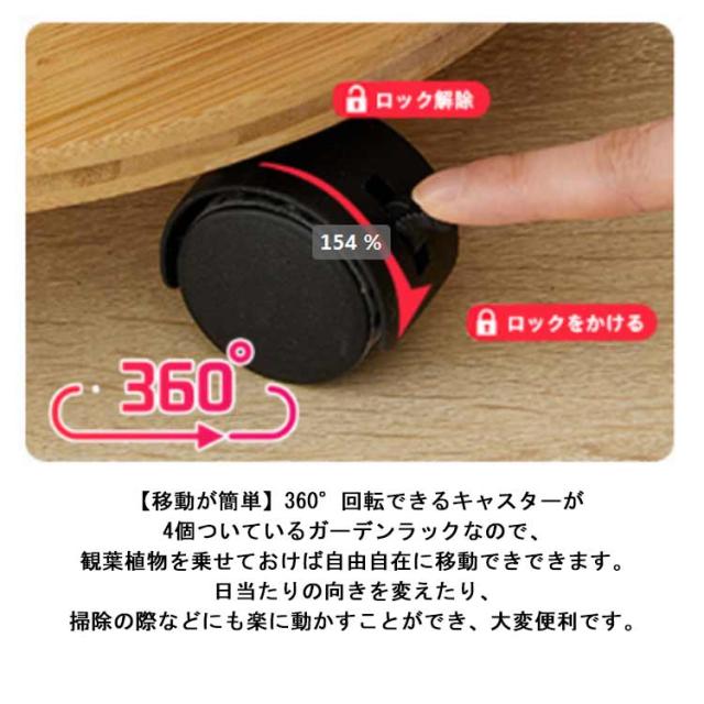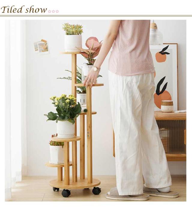 | キャスター付き5段フラワースタンド。【直径33cm】【高さ90cm】 【竹素材】このフラワースタンドの本体は、健康的で環境に優しく、耐久性と質感のある天然素材である竹で作られています。 【防水技術】この高低フラワースタンドの表面は天然の水性塗料で保護されており、独特の臭いがなく、毎日のお手入れに便利で、1回の拭き取りできれいになります。 【移動が簡単】360°回転できるキャスターが4個ついているガーデンラックなので、観葉植物を乗せておけば自由自在に移動できできます。日当たりの向きを変えたり、掃除の際などにも楽に動かすことができ、大変便利です。 【安定した構造】このリビングルームフラワースタンドは科学的な構造設計を採用しており、トレイとサポートロッドは二重に固定されており、安定した構造と強力な耐荷重性を備えています。 | |
