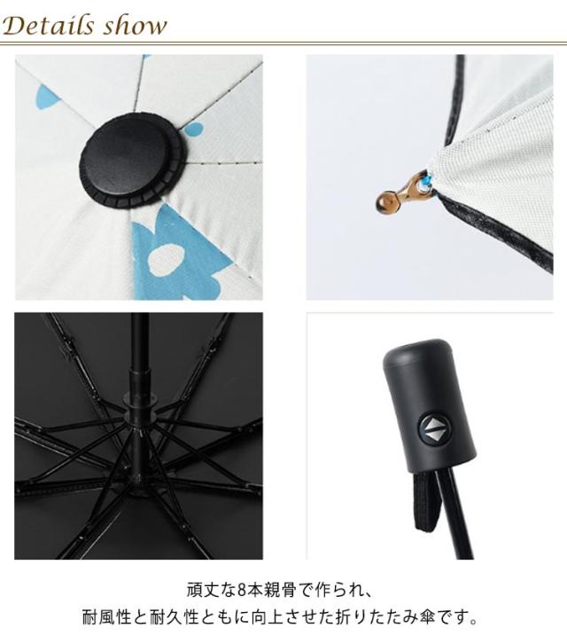 | 裏面生地には遮熱素材を採用し紫外線99.9%カット 紫外線が気になる季節はもちろん、 表面の特殊撥水コーティング加工で雨の日にも活躍。 頑丈な8本親骨で作られ、耐風性と耐久性ともに向上させた折りたたみ傘です。 高強度グラスファイバーにより柔軟性と強度を併せ持つ傘骨を採用し、防食加工が施された傘のフレームは超強靭で錆びにくい上に、強風に遭おれても豪雨に打たれても折れたり曲がったりしにくいです。 超高密度の布材料で作られ、撥水性が良い。水切れの良い撥水加工が施されていますので軽く振るだけでほとんどの雨水が振り払えます。水滴がかさに落ちた瞬間に水玉になりコロコロと滑り落ちていきます。 | |