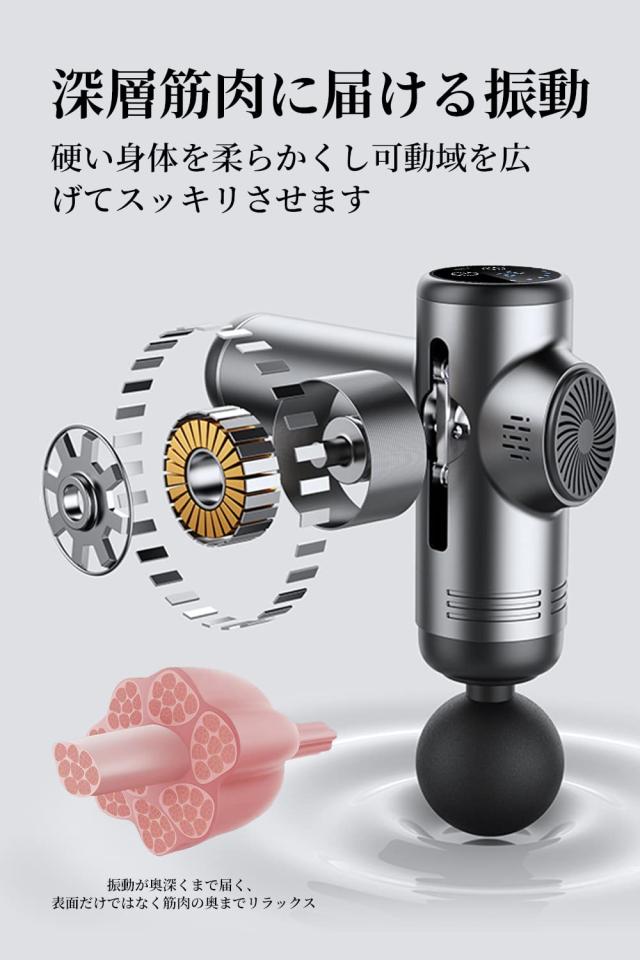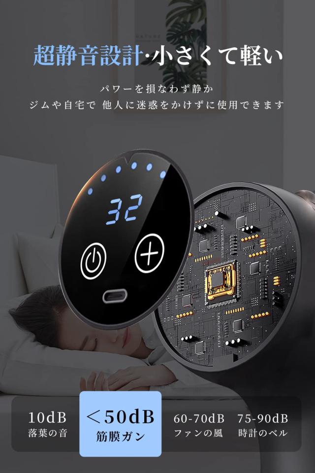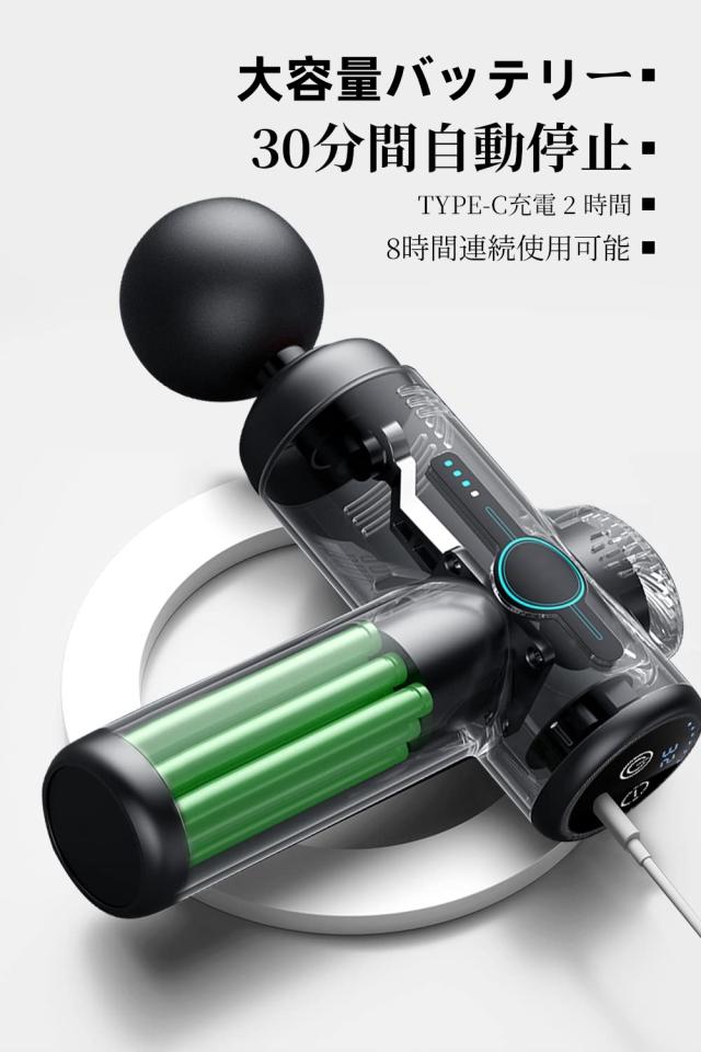 【低騒音・大容量バッテリー】ミュートチップを搭載し、運転音は約 45db で、ファンの運転音よりも小さく、無視ほどの音です。低騒音で、ジムや自宅で使用しても、周りの方にご迷惑がかからなくて、いつでもどこでも使用を楽しむことができます。高出力モーターを搭載し、大容量バッテリーとともに、毎日10分の使用で、1の段階で60日間連続使用が可能です。Type-C充電デザインを採用して、充電器、パソコンなどもマッスルガンに筋膜ガン充電可能、電気なしの心配がないです。