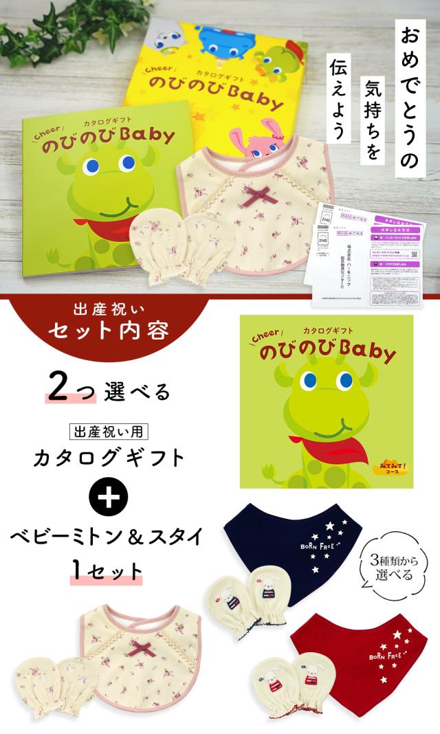 出産祝い カタログギフト のびのび Baby 2つ選べる みてみて!コース& ミトン&スタイ セット<新作商品>【3点セット ビブ バンダナスタイ 3種から選べる よだれかけ 日本製 御祝い お祝い 男の子 女の子 赤ちゃん ベビー 育児グッズ 友達 ギフトセット ビセラ シャディ】
