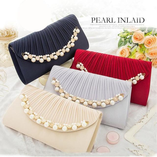 収納力に満足できる大きめなクラッチバッグ が人気ポイントの一つ、可愛いパールが施され、上品感UP!