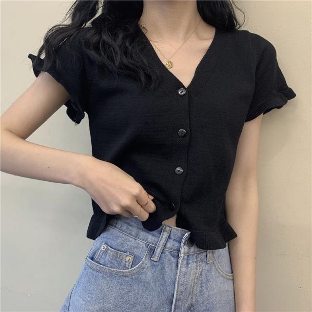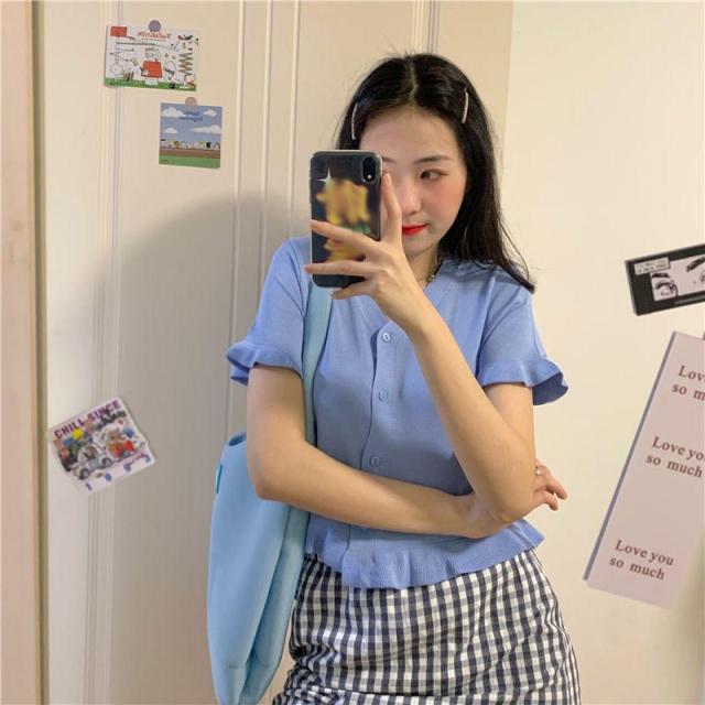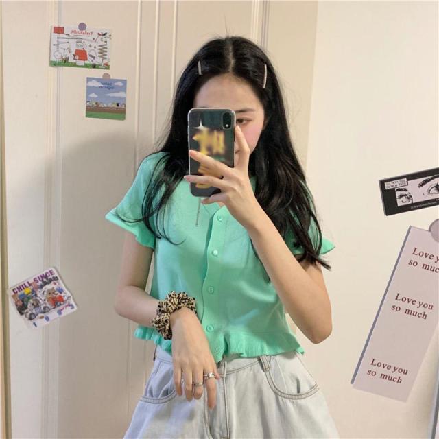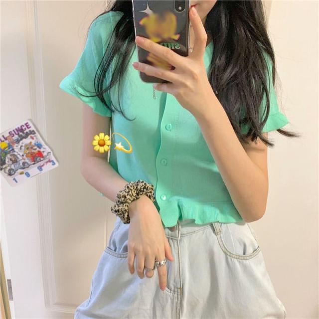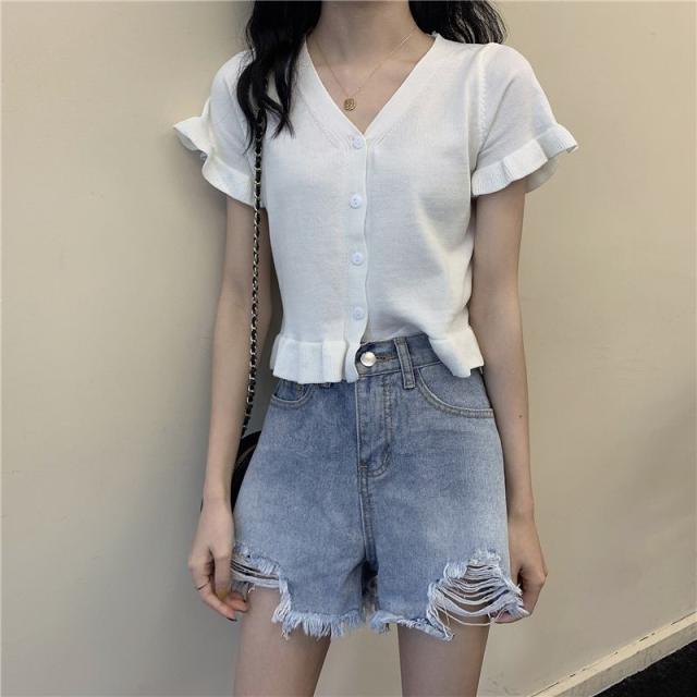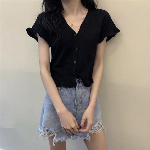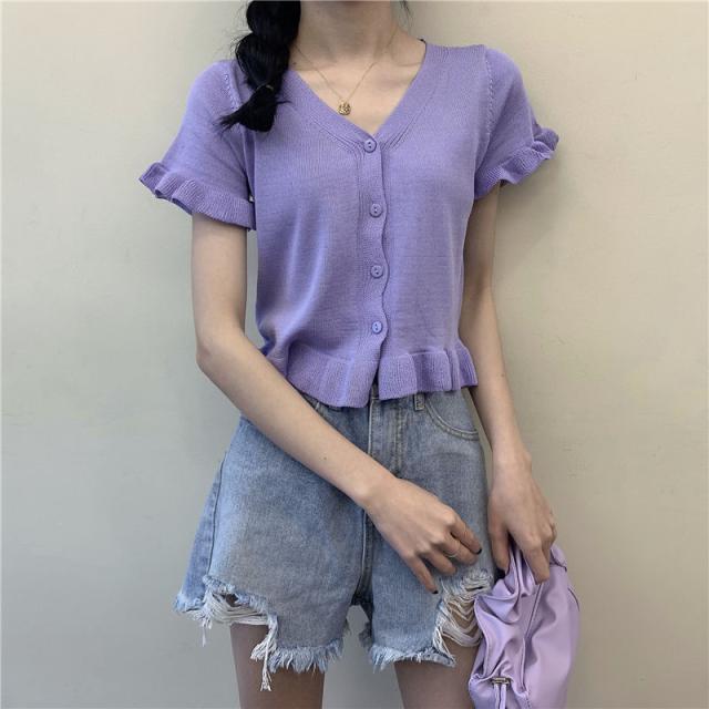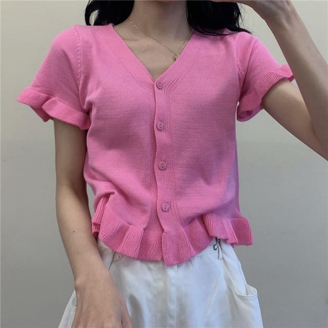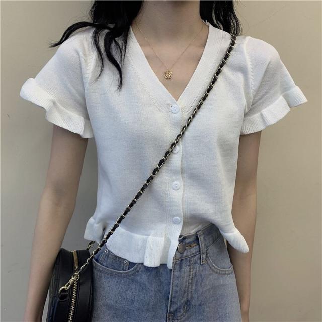 送料無料 カーディガン レディース サマーニット 半袖カーディガン 羽織り フリル ショート丈 コンパクト 冷房対策 ボタン Vネック 前開き きれいめ