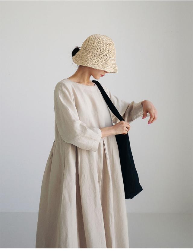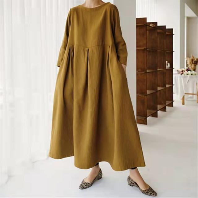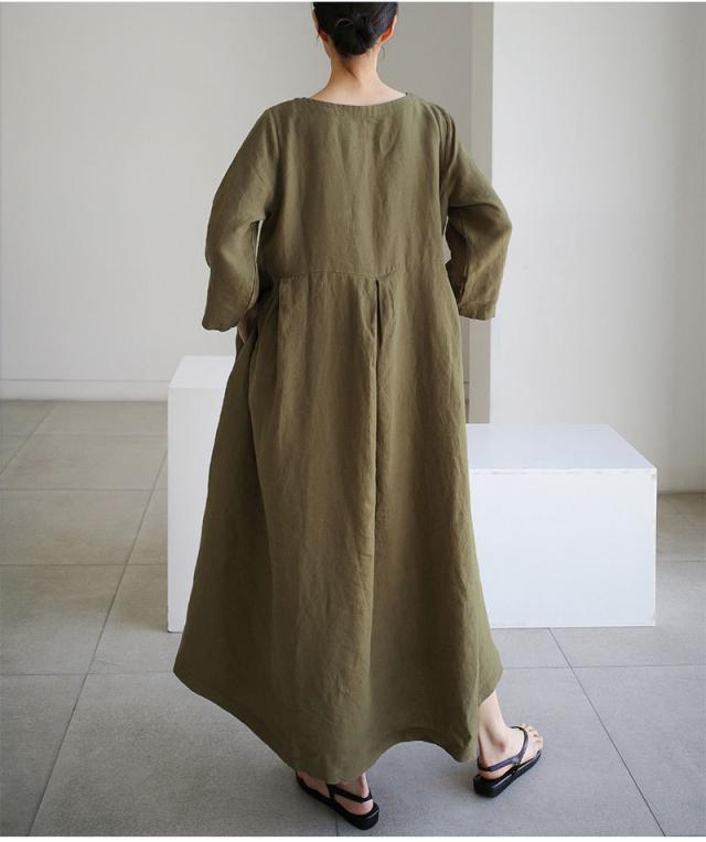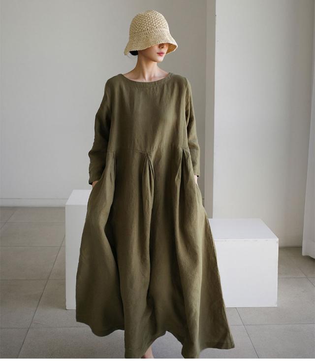ワンピース リネン 長袖 タック入り 綿 麻 体型カバー クルーネック ロングワンピース 30代 40代 50代