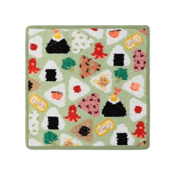 「オムスビコロリン」シリーズのハンカチです。ついつい目移りしてしまいそうな、さまざまな具が入ったおむすびをデザインしました。卵焼きやタコさんウインナー、ブロッコリーも添えています。見ているだけで楽しくなる、カラフルなカラーも嬉しい。お弁当を開けたときのわくわくがたっぷり詰まっているアイテムです。