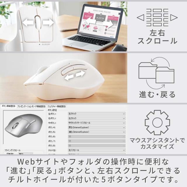 【エレコム Bluetooth マウス 静音 ワイヤレス 7ボタン チルトホイール付 ホワイトの商品詳細】