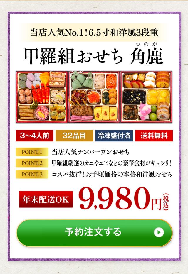 送料無料9,980円!甲羅組おせち「角鹿」6.5寸×3段 3〜4人前 盛り付け済み 冷凍 主原料に中国産不使用 おせち料理 ※年末追加送料対象外/送料無料にてお届けします。