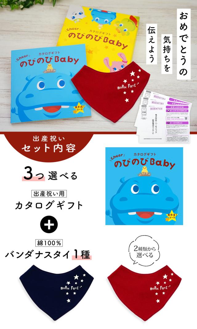 出産祝い カタログギフト のびのび Baby 3つ選べる あそぼ!コース&バンダナスタイ セット<新作商品>【ビブ bib 色が選べる 赤 紺 よだれかけ 日本製 御祝 御祝い お祝い 男の子 女の子 赤ちゃん ベビー 育児グッズ 友達 人気 ギフトセット ビセラ シャディ】