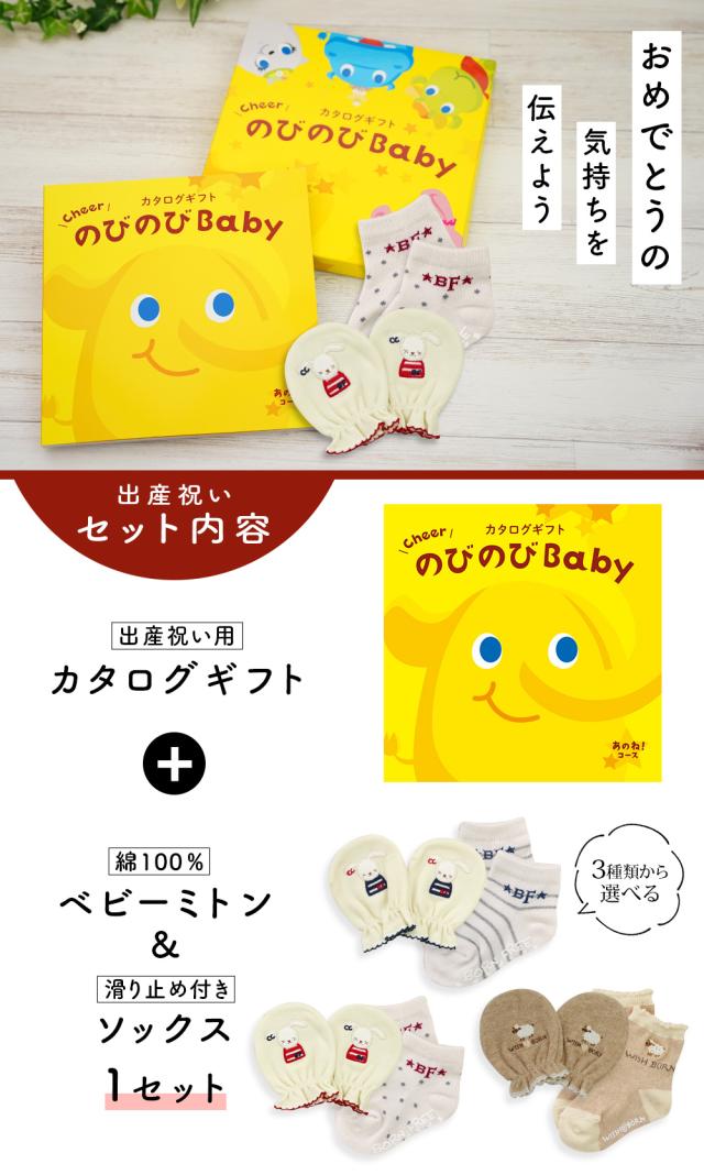 出産祝い カタログギフト のびのび Baby あのね!コース& ミトン&ソックス セット<新作商品>【3点セット 靴下 手袋 3種から選べる 日本製 御祝い お祝い 男の子 女の子 赤ちゃん ベビー 育児グッズ 友達 ギフトセット ビセラ シャディ】