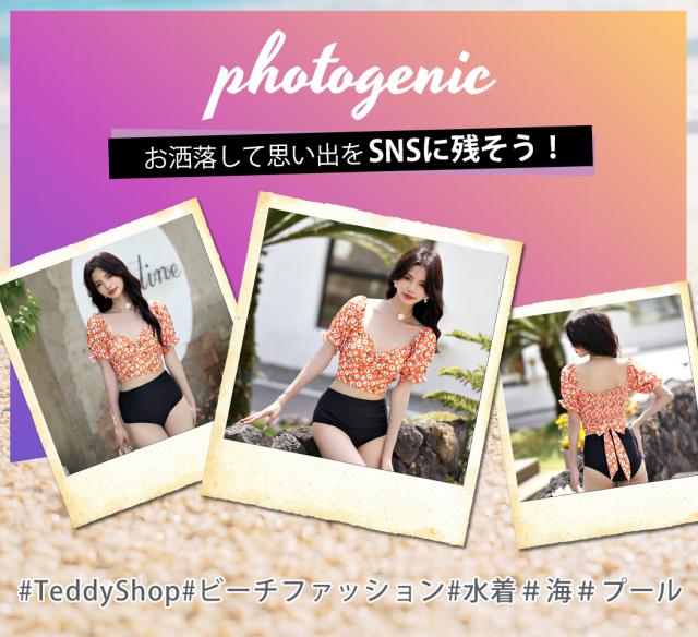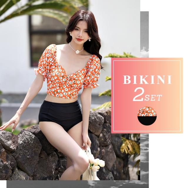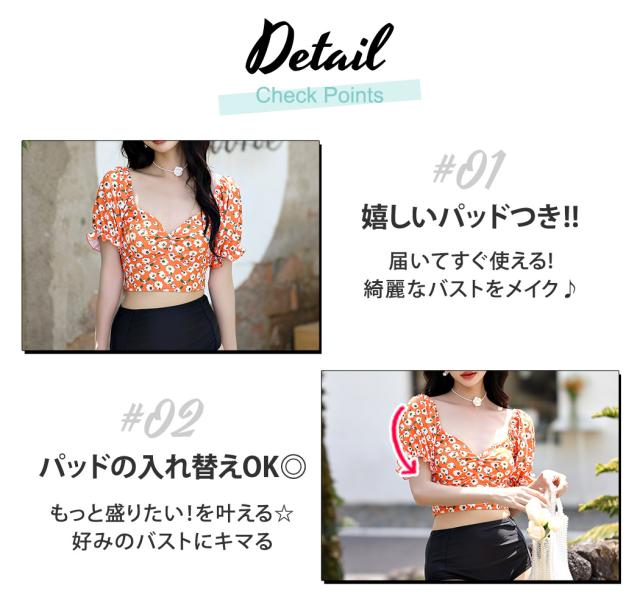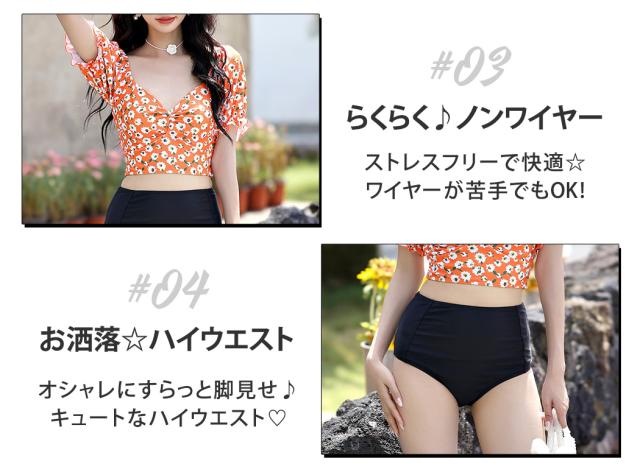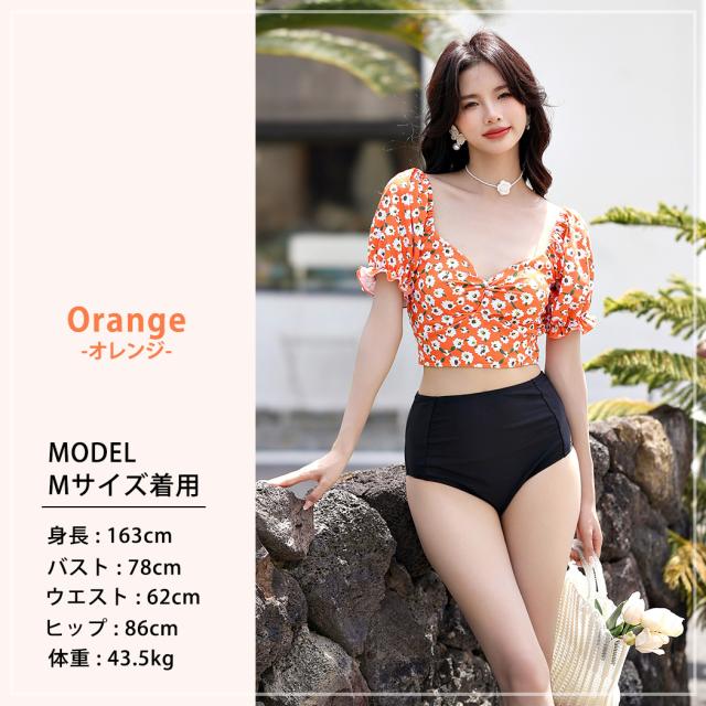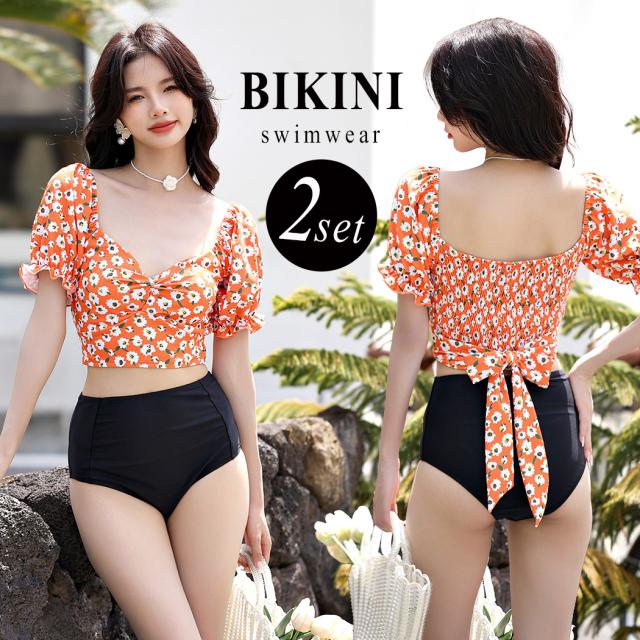 春新作 水着 レディース ビキニ おしゃれ かわいい セクシー 花柄 無地 ミックスマッチ 2点セット 半袖 上下別柄 パフスリーブ バック シャーリング リボン バックシャン ハイウエスト パッド付き ノンワイヤー 二の腕 ウエスト カバーアップ 夏 旅行