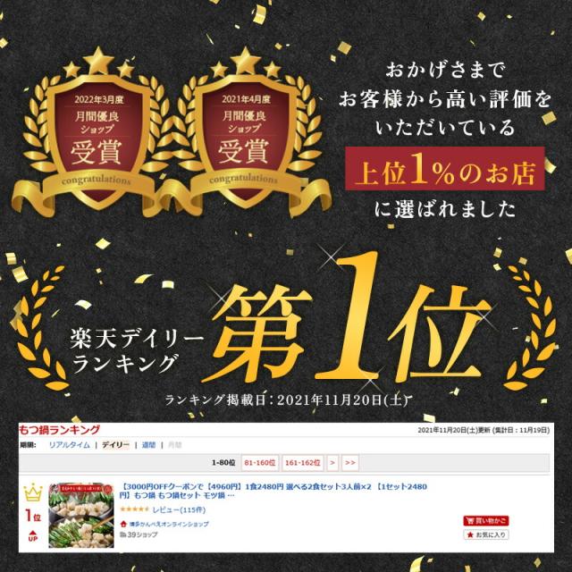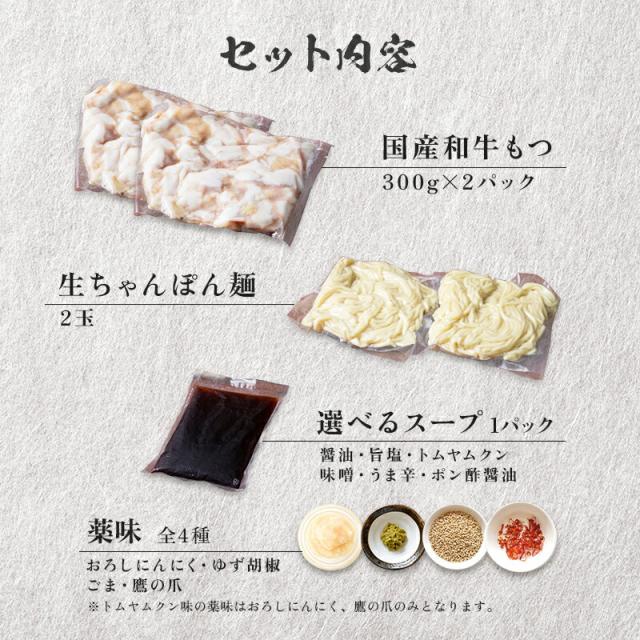 | 国産国産和牛もつ(ミックスホルモン)600g、もつ鍋スープ(旨塩200CC 醤油、味噌、旨辛、ポン酢醤油、240CC トムヤムクン味380CC)×2、簡単調理レシピ、煎り胡麻、鷹の爪、柚子胡椒、きざみにんにく、ちゃんぽん麵4玉 | |