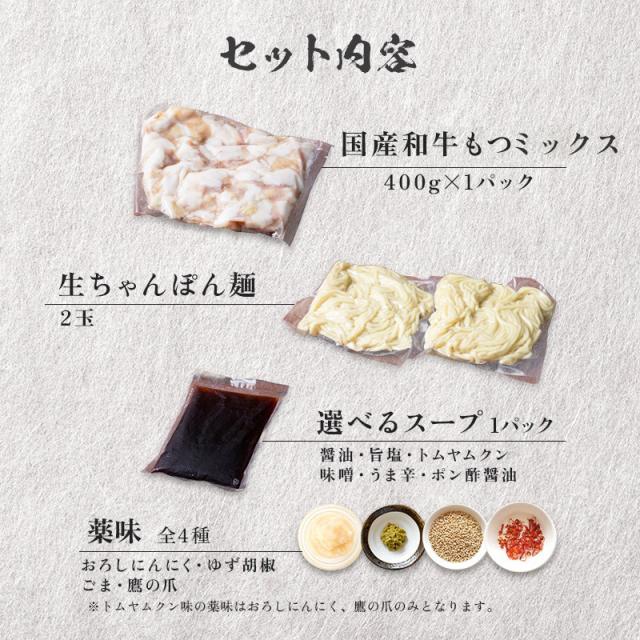 | 国産和牛もつ(ミックスホルモン)(400g)、もつ鍋スープ(旨塩140CC 醤油、味噌、旨辛、ポン酢醤油、160CC トムヤムクン味250CC)、簡単調理レシピ、煎り胡麻、鷹の爪、柚子胡椒、きざみにんにく、ちゃんぽん麵2玉 | |