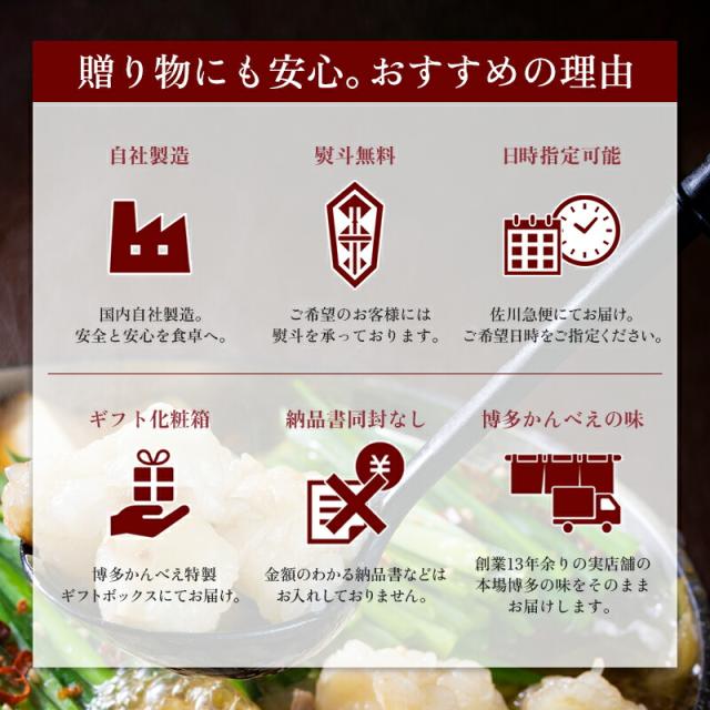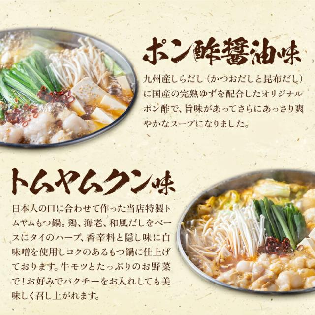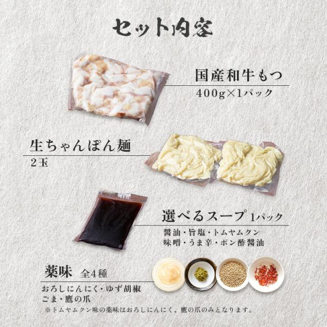 | 国産和牛もつ(ミックスホルモン)(400g)、もつ鍋スープ(旨塩200CC 醤油、味噌、旨辛、ポン酢醤油、240CC トムヤムクン味380CC)、簡単調理レシピ、煎り胡麻、鷹の爪、柚子胡椒、きざみにんにく、ちゃんぽん麵2玉 | |