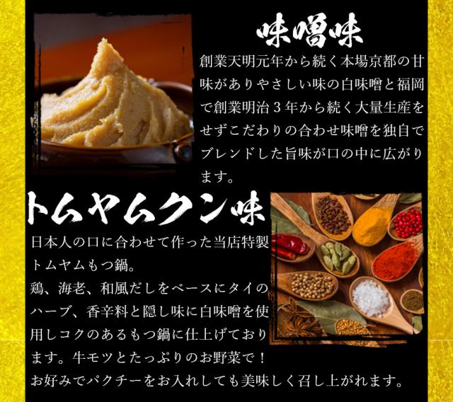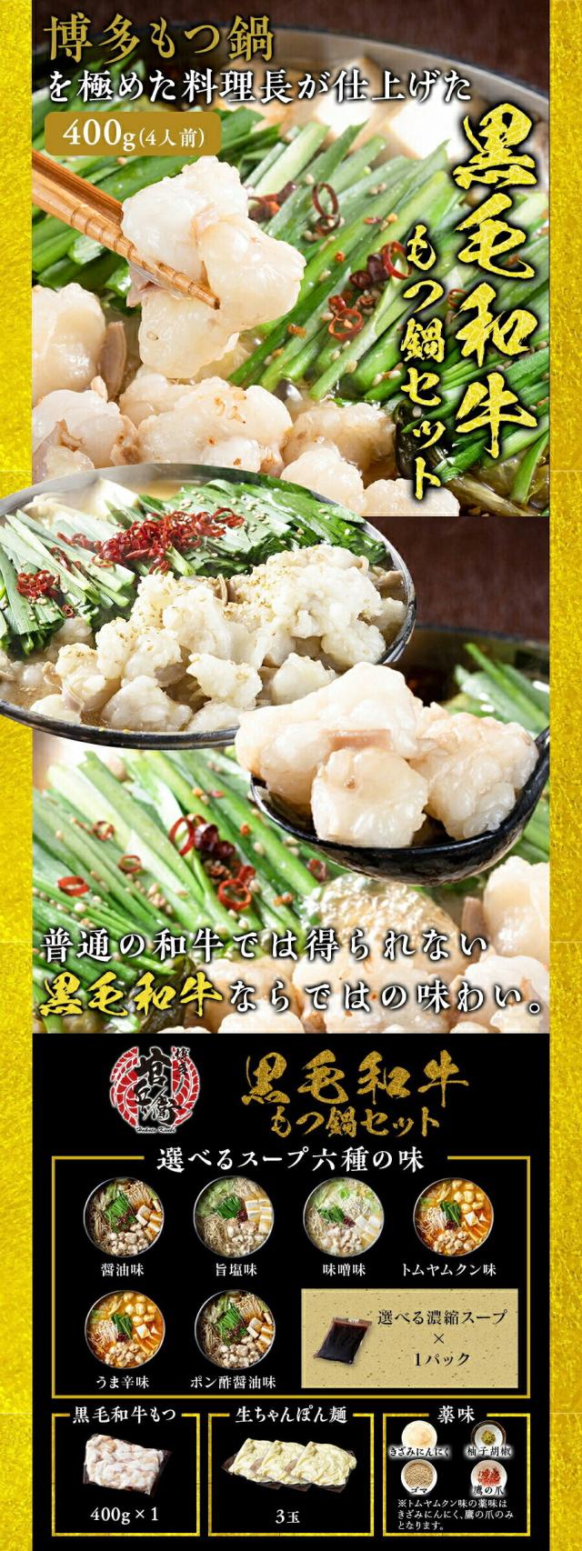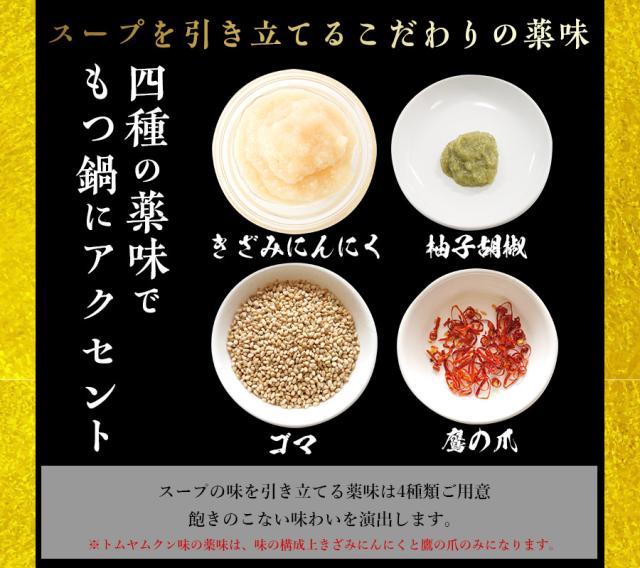 | 国産国産和牛もつ(ミックスホルモン)(400g)、もつ鍋スープ(旨塩:300g、醤油・味噌:375g、トムヤムクン:850g、うま辛:390g、ポン酢醤油:375g)、簡単調理レシピ、煎り胡麻、鷹の爪、柚子胡椒、きざみにんにく、ちゃんぽん麵3玉 | |