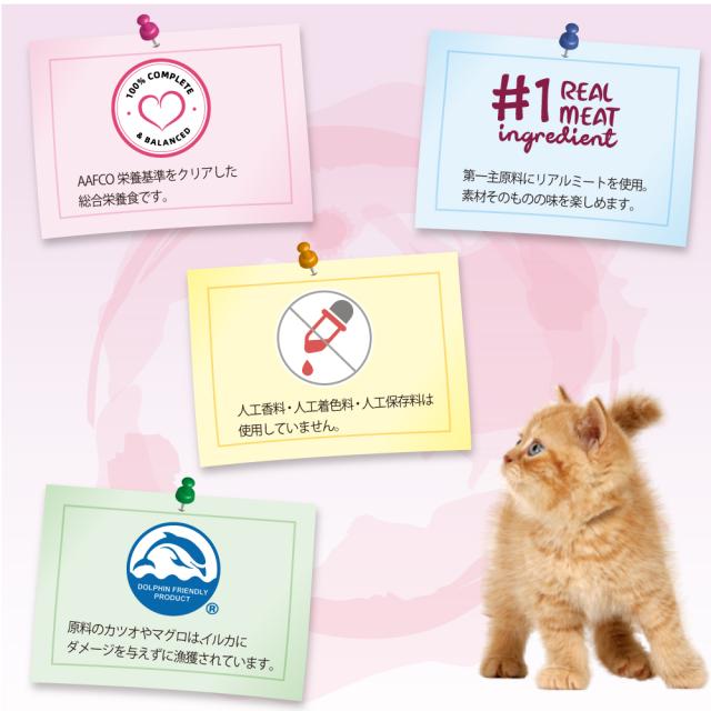 リアルミートを第一主原料とし、AAFCO基準をクリアした人工着色料、香料、防腐剤不使用のおいしいレシピ。