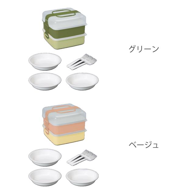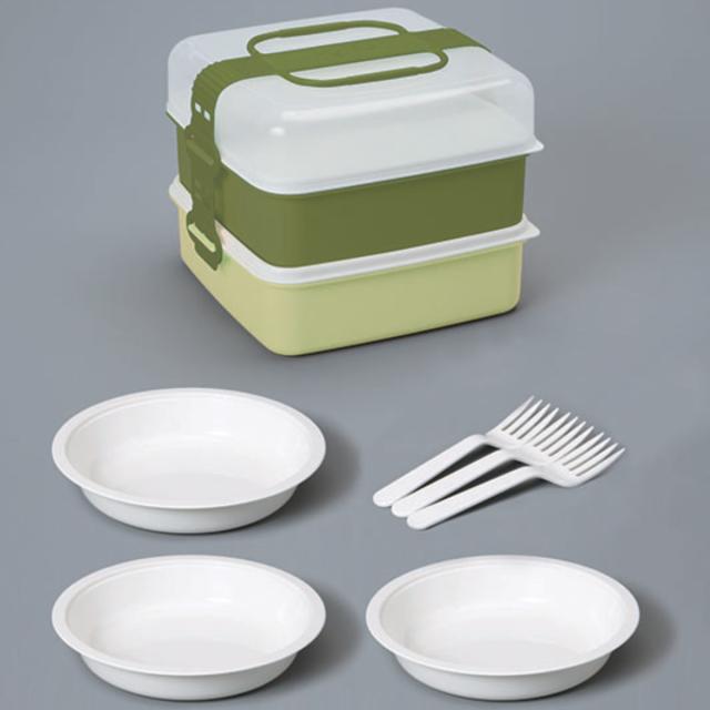 | 内容量 | 1個 (本体、上フタ、中フタ×2、取り皿×3、フォーク×3、ベルト) |