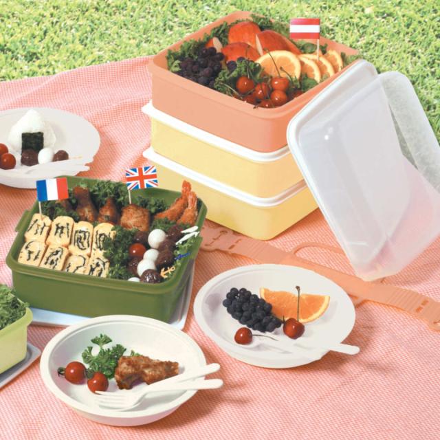 ピクニックや運動会、持ち寄りパーティなどにぴったりな大容量の3段のお弁当箱です。各段にはフタがついているため、食材の混ざり合いや匂い移りを気にすることなく、美味しさを保つことができます。8100mlの広々とした容量は、大人数の家族や友人との食事に最適です。