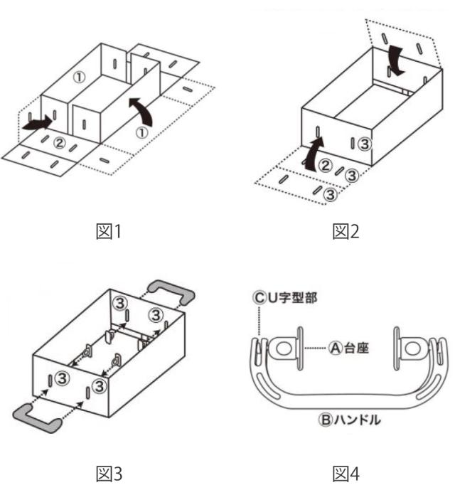 ハンドルと丸い輪の付いた台座は、 図4のように一体になって同梱されている場合と、 すでに 切り離されてバラバラに同梱されている場合があります。 一体になっている時は、ハンドル2個と、 丸い輪の付いた台座4個を上下に数回折り曲げて、それぞれ別々に取りはずして下さい。