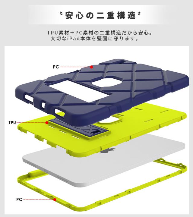 頑丈なPC素材と柔軟なTPU素材の組み合わせでiPadを優しくしっかり保護します。