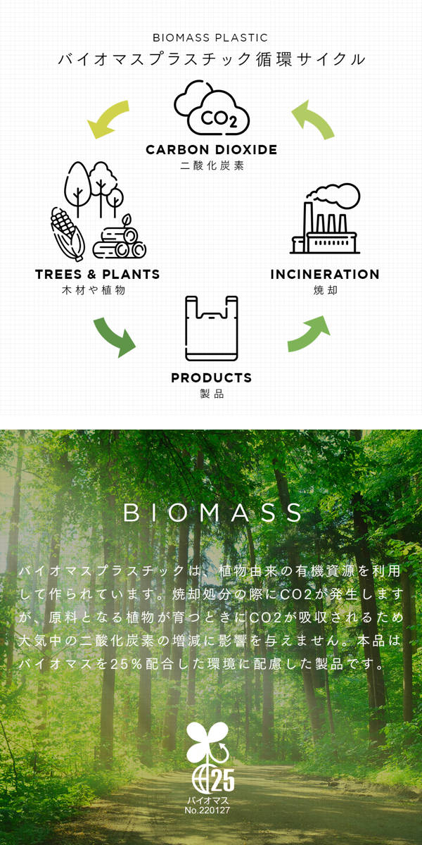 こちらの商品はバイオマスを25%配合した素材で作られており、環境に配慮した製品となっております。
