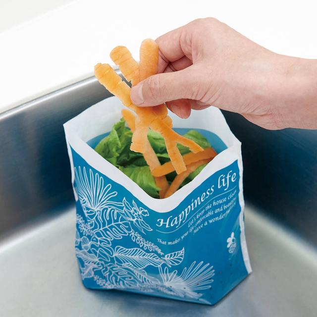 マチ付きで立てて置くこともできます。三角コーナーの代わりにシンクに広げて置けば、キッチンがすっきり綺麗に保てます。しっかりと自立してくれるので手が塞がることなく、両手で鍋などを持ちながらでも、簡単に中身を捨てることができます。