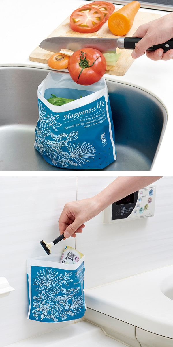テープで貼るだけでゴミ箱代わりに使えるゴミ袋です。キッチンや洗面台、お風呂などゴミ箱を置くと狭くなってしまう場所でもコンパクトに使えて便利です。穴あきタイプと穴なしタイプがあるので、使用する場所に合わせてお選びいただけます。