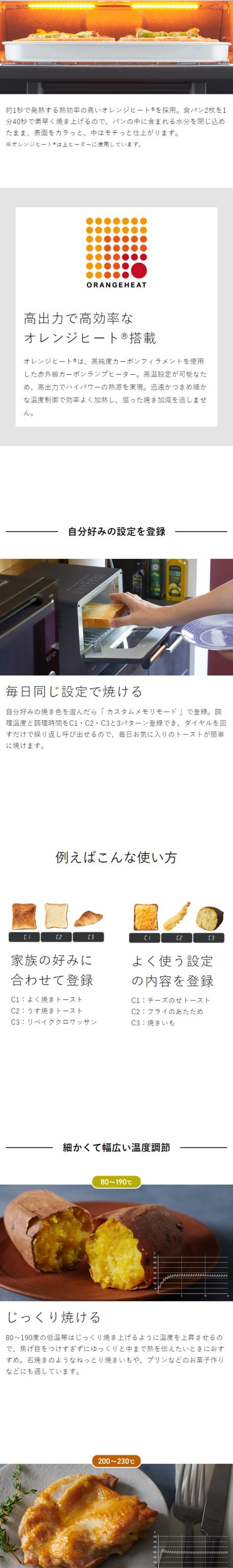 約1秒で発熱してすぐにトーストが焼けるオーブントースター。高効率&高出力の赤外線カーボンヒーター搭載。80〜240度までの温度設定、90分タイマー、カスタムメモリモード付きです。