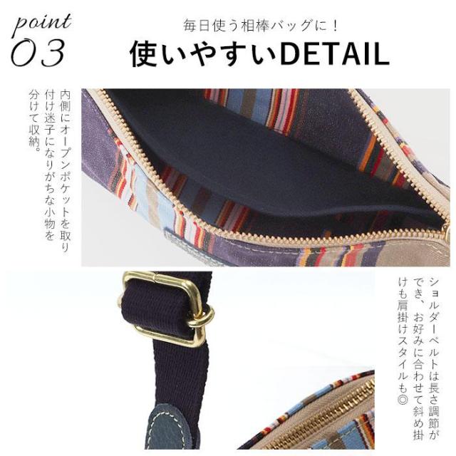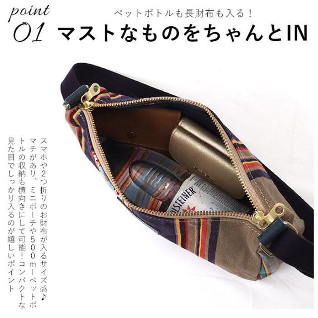フランス政府認定!老舗メーカーが紡ぐストライプの生地を使った「LES TOILES DU SOLEIL ソレイユショルダーSS」が登場。【レ・トワール・デュ・ソレイユ】160年を超える歴史を持つテキスタイルメーカーが発信しているブランド。伝統的な製法を用いて紡がれた、カラフルでフランスらしい配色のストライプの生地が特徴的!独自の特徴を持つストライプ生地が、フランス政府より重要文化財に認定。【ミニマルな収納】スマホや2つ折りのお財布が入るサイズ感♪ちょっとそこまでのお出かけやミニマル女子さんにおススメ♪マチがあり、ミニポーチや500mlペットボトルの収納も横向きにして可能!コンパクトな見た目でしっかり入るのが嬉しいポイント。【ポケット付き】内側にオープンポケットを取り付け迷子になりがちな小物を分けて収納。【長さ調節OK】ショルダーベルトは長さ調節ができ、お好みに合わせて斜め掛けも肩掛けスタイルも◎【撥水加工】パラフィン加工が施されており防水・防汚性あり!汚れたり多少の雨ならサッと拭き取るだけでお手入れ楽チン。【細部までこだわり】革部は牛革を採用。ファスナーは、ゴールドカラーで統一し、よりシックでこなれた印象に♪前面と背面の配色や、ラインの太さを微妙に変えたデザインが魅力的。フランスのエスプリを身近に感じる、おしゃれなカラーバリエーション。【ポケット仕様】メインルーム・・・オープンポケット×1
