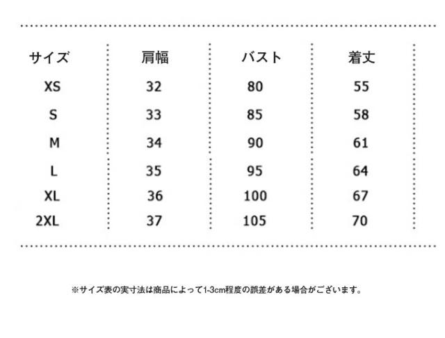 | サイズについての説明 | サイズ 肩幅 バスト 着丈 ※サイズ表の実寸法は商品によって1-3cm程度の誤差がある場合がございます。 |